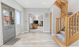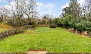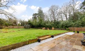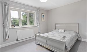 - Double garage-Private driveway side access to a large south-facing rear garden, which is mainly laid to Indian sandstone patio, remainder being laid to lawn overlooking woodland beyond