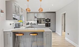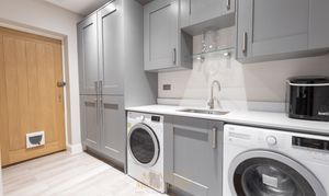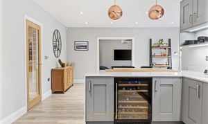 To the rear of the property is the impressive south-facing open-plan kitchen and dining area, enjoying views over the landscaped rear garden. The kitchen and utility room are finished in a stylish graphite grey shaker design with Bianco Norte quartz work surfaces. Features include a large kitchen breakfast bar with seating for two, a Franke undermount stainless steel sink with Olympus swivel spout mixer tap, Bosch induction hob, single oven and combination microwave, a 46-bottle wine cooler, and integrated Hotpoint dishwasher, fridge, and freezer, located within the utility room.