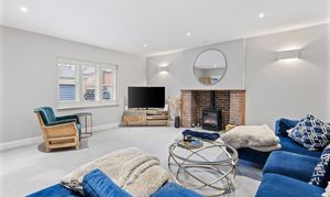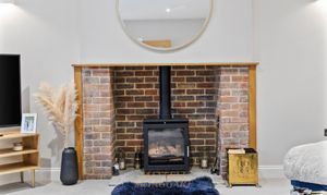 Also positioned at the front of the home is the living room, providing plenty of space for sofas, occasional tables, and seating, and featuring a cast-iron log burner for added warmth and character.