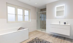 The principal bedroom is a large double room featuring a private balcony overlooking the rear garden, fitted wardrobes, air conditioning and a luxurious en-suite bathroom. The en-suite comprises a wall-hung vanity unit, basin, LED mirror, low-level wall lighting, a frameless shower enclosure, and a striking freestanding bath with mixer taps.