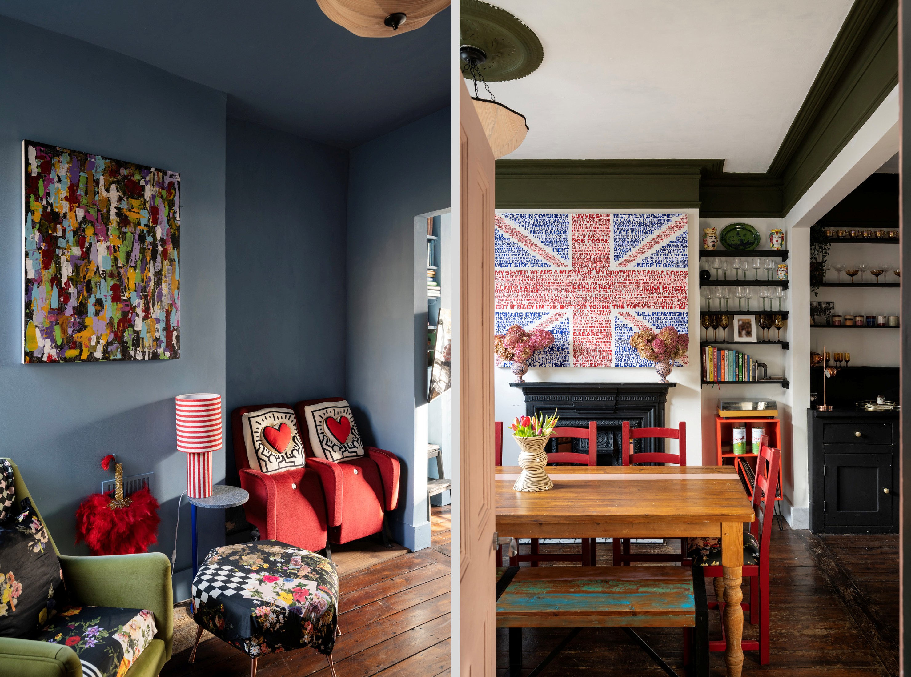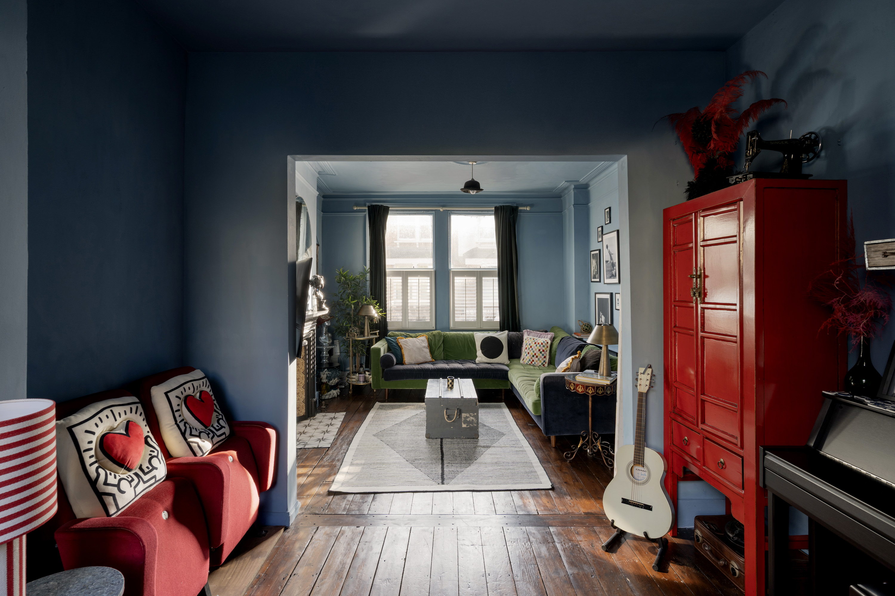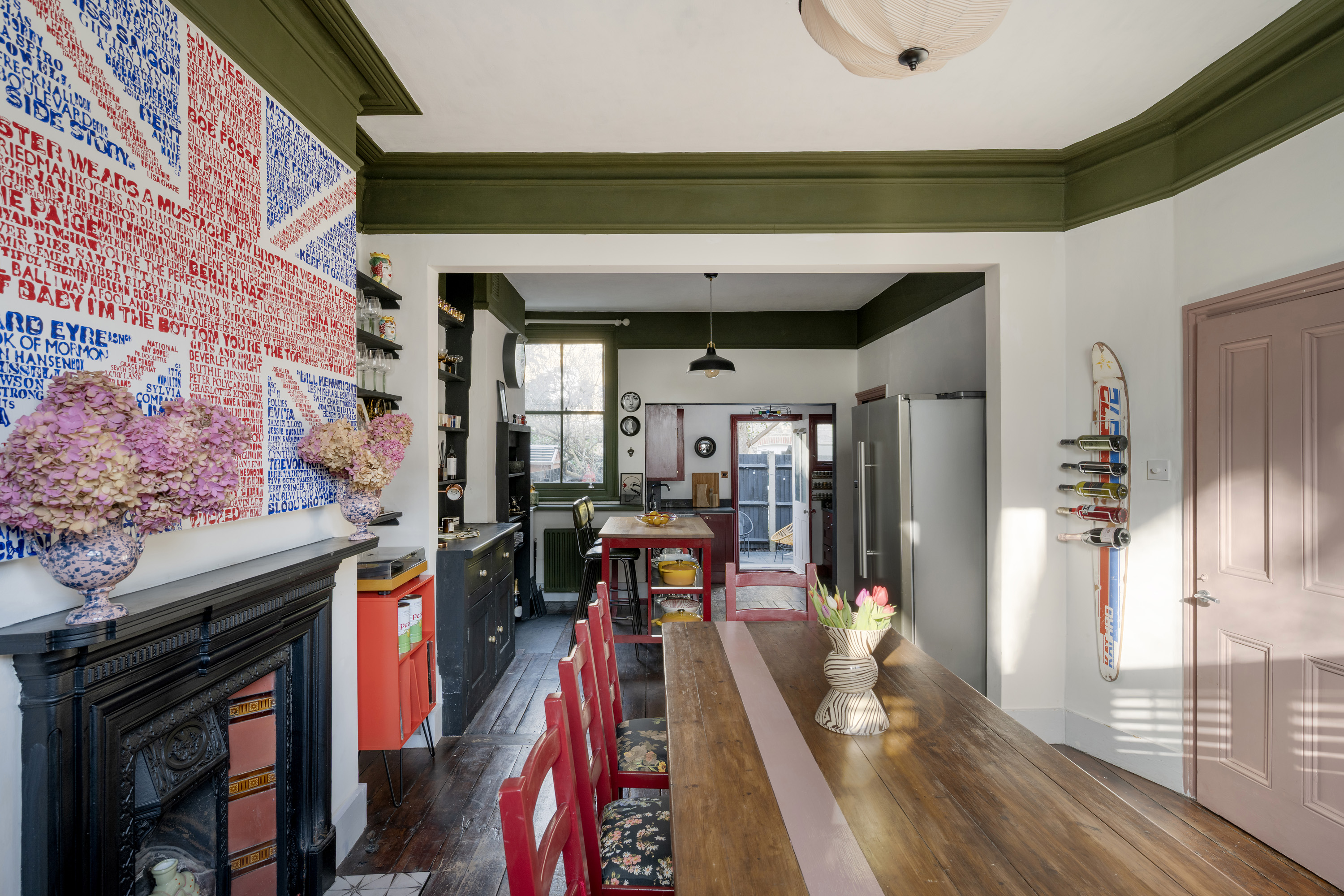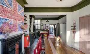 Upon entering, you are immediately greeted by striking geometric floor tiles in deep burgundy, inky blue and soft neutrals, creating a dramatic first impression. Directly off the hallway are two double reception rooms, both full of atmosphere, anchored by original fireplaces, dark timber floors and dramatic wall colours that create an intimate, atmospheric feel while allowing natural light to pour through the large timber sash windows. One reception room is styled as an intimate sitting room with deep blue walls and layered textures; the other opens into a welcoming dining space where heritage detailing is set against modern artwork and statement lighting.