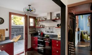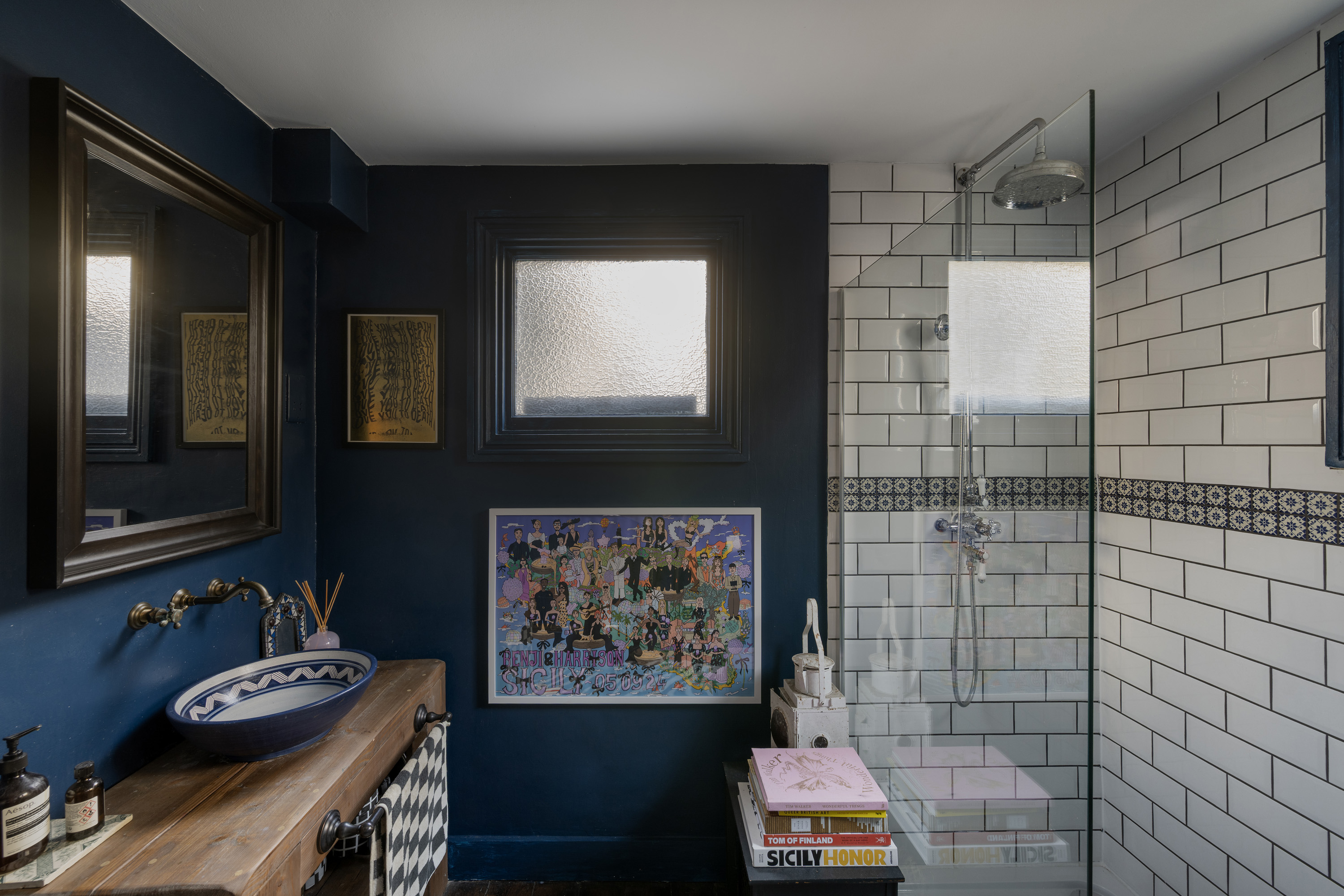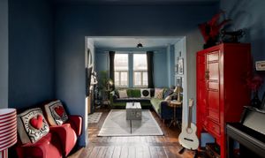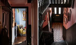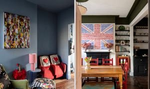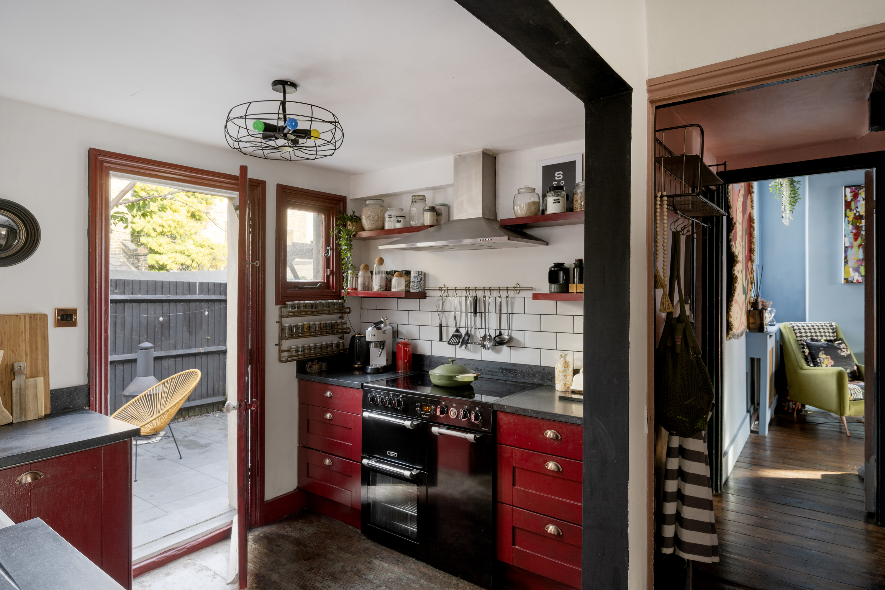 Upon entering, you are immediately greeted by striking geometric floor tiles in deep burgundy, inky blue and soft neutrals, creating a dramatic first impression. Directly off the hallway are two double reception rooms, both full of atmosphere, anchored by original fireplaces, dark timber floors and dramatic wall colours that create an intimate, atmospheric feel while allowing natural light to pour through the large timber sash windows. One reception room is styled as an intimate sitting room with deep blue walls and layered textures; the other opens into a welcoming dining space where heritage detailing is set against modern artwork and statement lighting.
