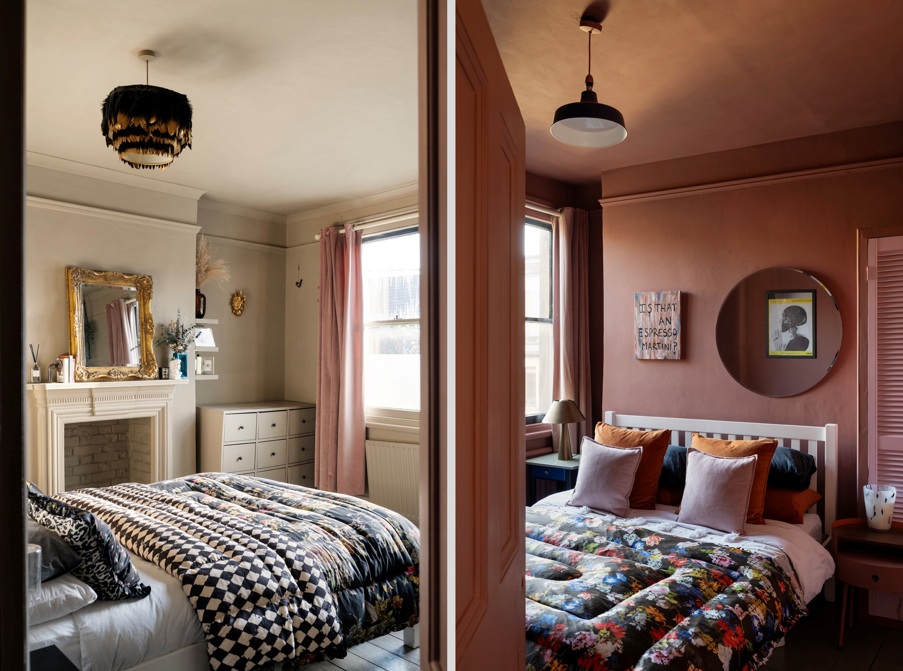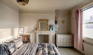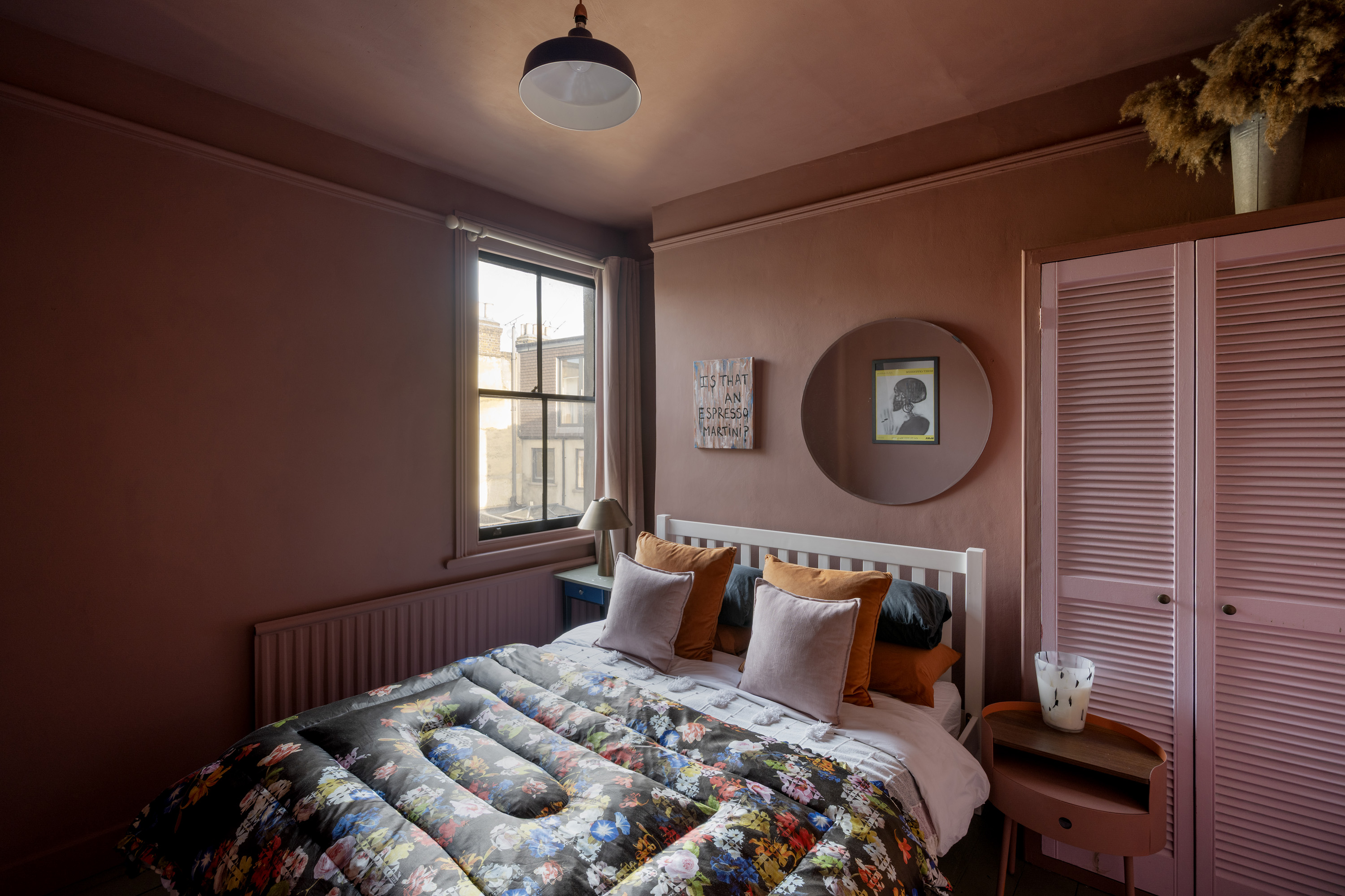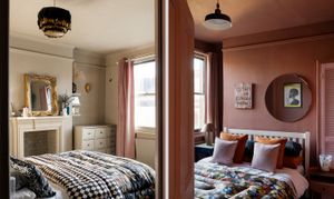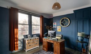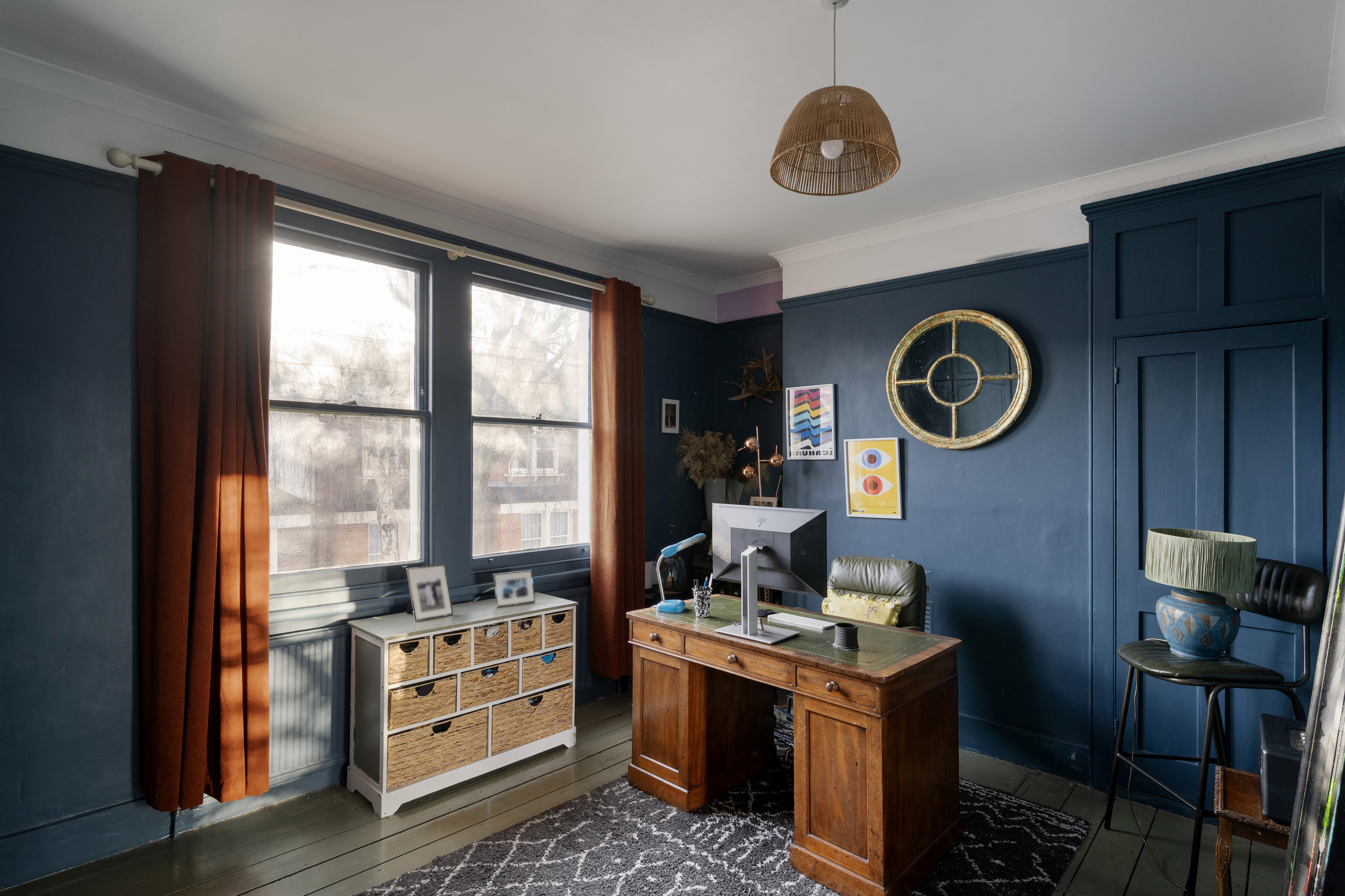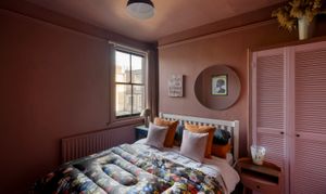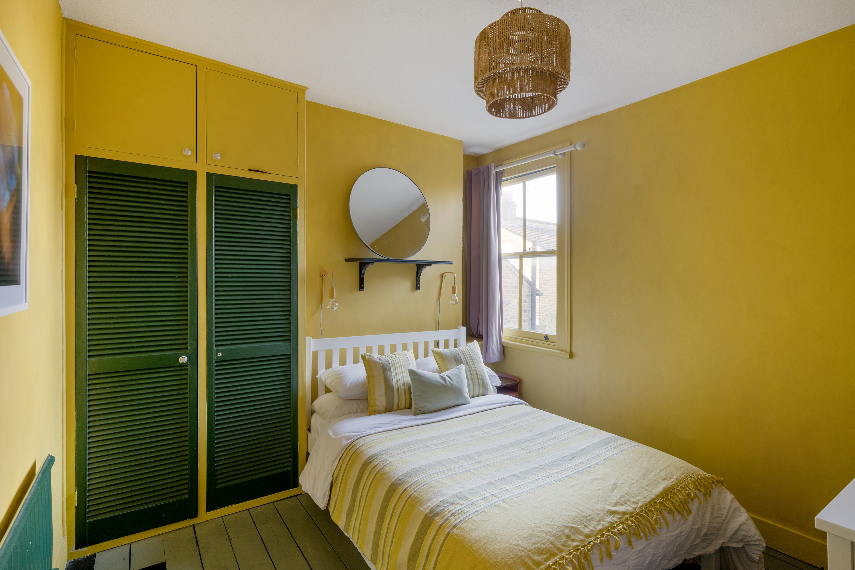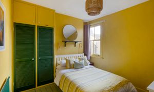 Upstairs, four bedrooms lead off the landing, each with its own identity, unified by thoughtful colour choices and natural light. The two largest bedrooms are positioned at the front of the house; one currently used as a home office and the other the principal bedroom with both featuring built-in wardrobes. Two further, equally characterful rooms are finished in joyful mustard yellow and warm terracotta tones, continuing the use of heritage-inspired paint colours throughout.