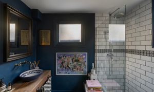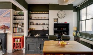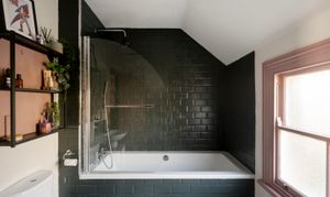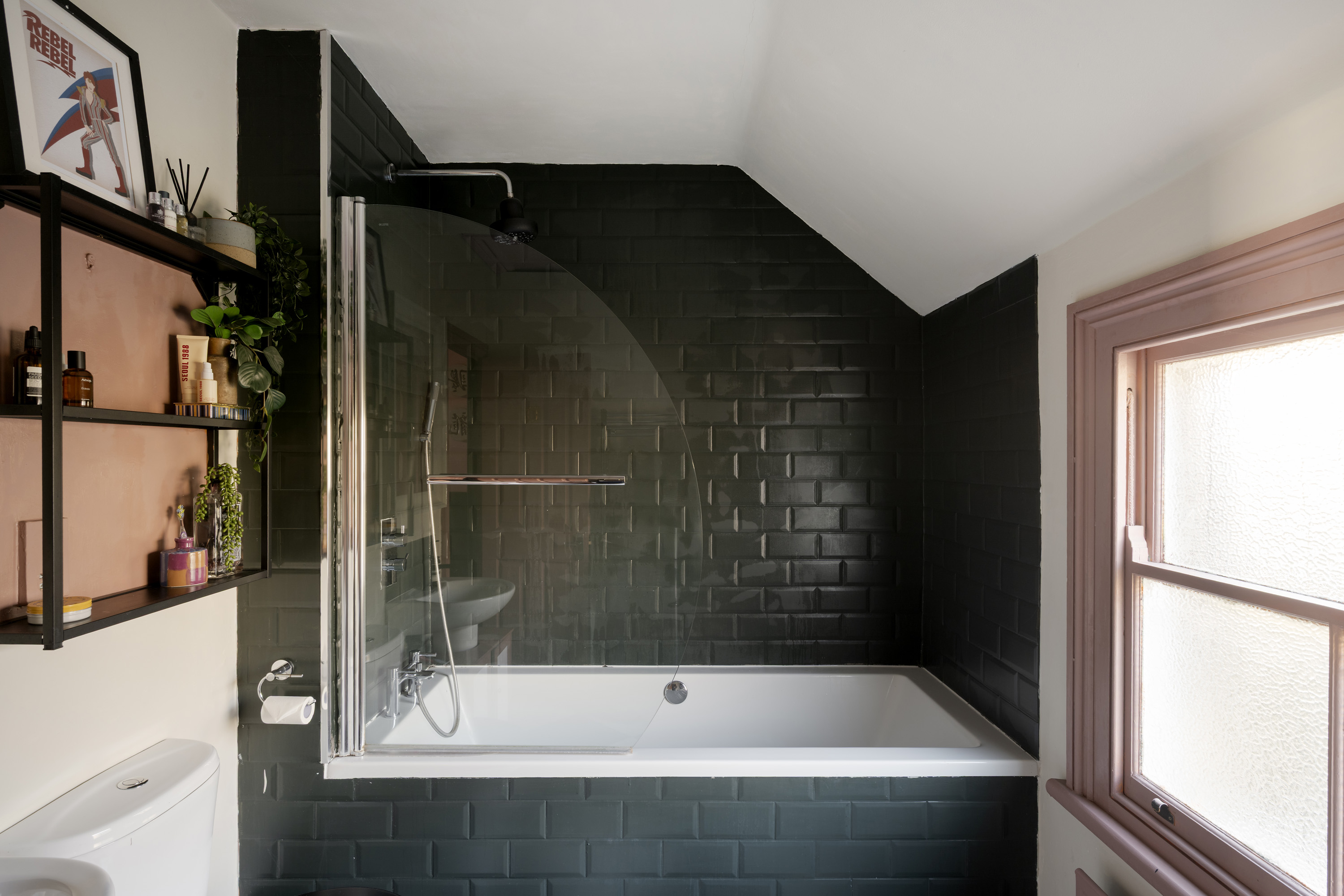 The bathroom features dramatic dark green tiling, a classic bath with overhead shower, and monochrome flooring for a modern Victorian feel. A separate shower room with toilet continues the design story with bold contrasts and graphic finishes.