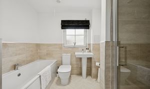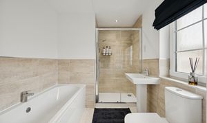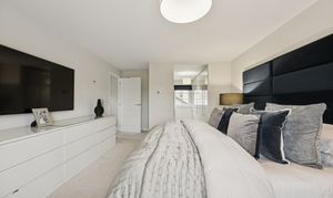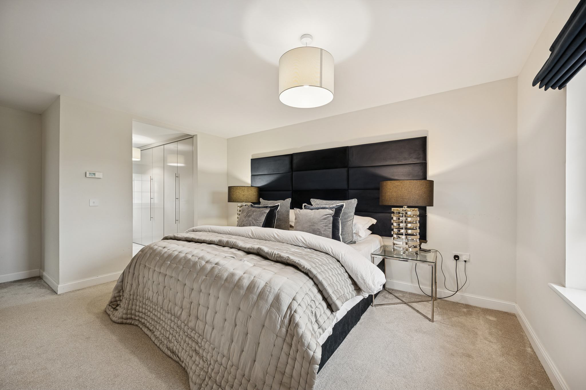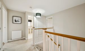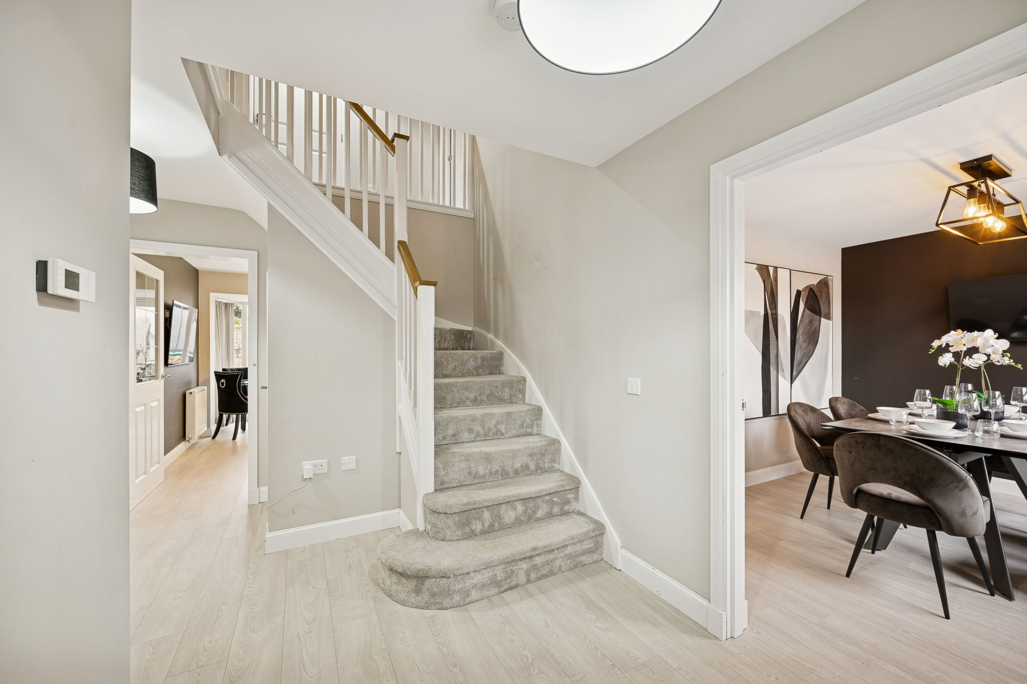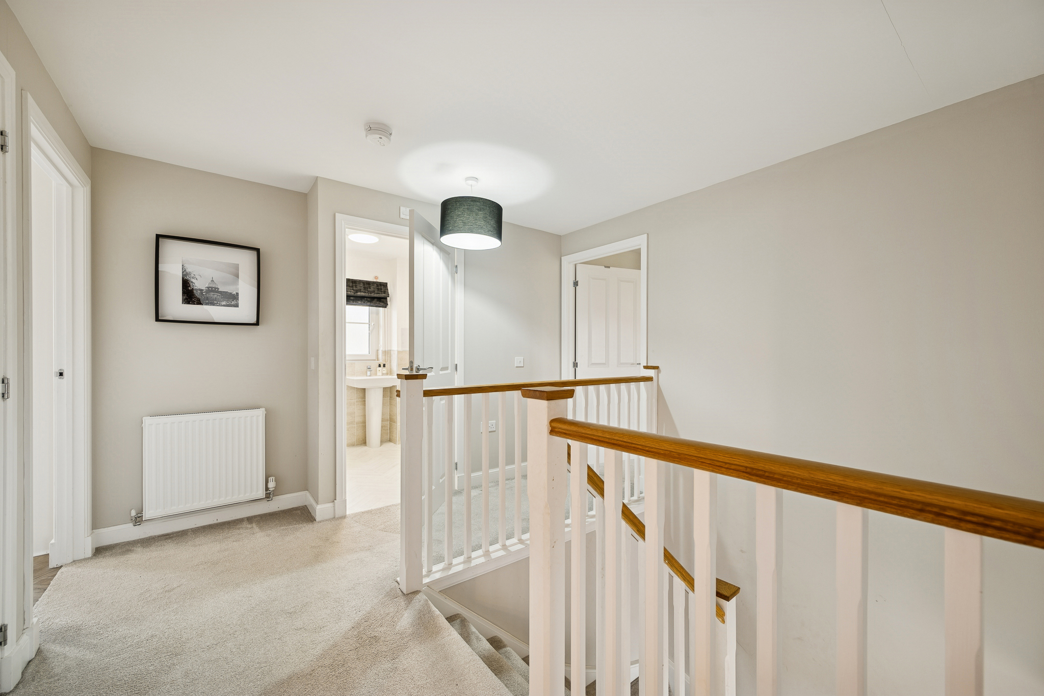 A striking galleried landing leads to four spacious double bedrooms. The luxurious principal suite boasts a private dressing area and a sleek en-suite shower room, while bedroom two also benefits from its own en-suite. A beautifully appointed four-piece family bathroom completes the upper level.