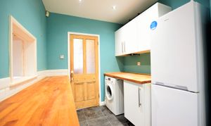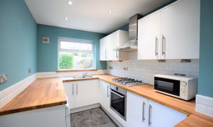 A second door from the dining room leads back to the hallway and into a modern Kitchen decorated in teal and white with complimentary dove grey flooring. Farmhouse style wooden worktops for food preparation contrast with the sleek oven, hob and extractor. Space is available for a washing machine and fridge freezer ideal for everyday life. A passe-plat will impress your guests as you serve culinary delights through to the dining room. Washing up offers views of the garden through the picture window and is a sunny spot for growing herbs on the windowsill.