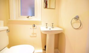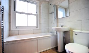 The refitted Bathroom is a balanced blend of modern and classic with sash window and relaxing bath adorned by panelled wood side alongside a heated towel rail and chic tiling. A shower over the bath is ideal for a refreshing start to the morning with the option of a sumptuous bath when relaxing.
