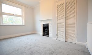 The second double bedroom is a design classic with a vintage ornate fireplace, this would look resplendent with pretty lights and scented candles for a luxury feel. A fitted wardrobe with white louvre doors completes the picture.