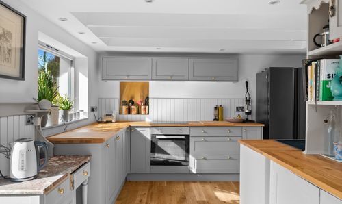 The first floor features three bedrooms and a period-style bathroom suite, complete with a luxurious roll-top bath, providing a tranquil sanctuary for relaxation. Throughout the house, stripped wood flooring adds to the timeless appeal of the interior, creating a seamless flow from room to room.