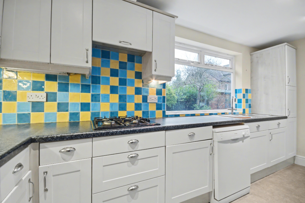 Located at the rear of the property with a door to the garden and double-glazed window providing garden views. Features white shaker-style cabinets, dark worktops, and colourful yellow and blue square tile splashback. Fitted with integrated gas hob, integrated double electric oven, and extractor over the hob. Stainless steel 1.5 sink with mixer tap. Vinyl flooring throughout with plenty of drawers and cupboards at both counter and wall-mounted levels. Space for a freestanding dishwasher and large American-style fridge freezer in the fireplace reveal.