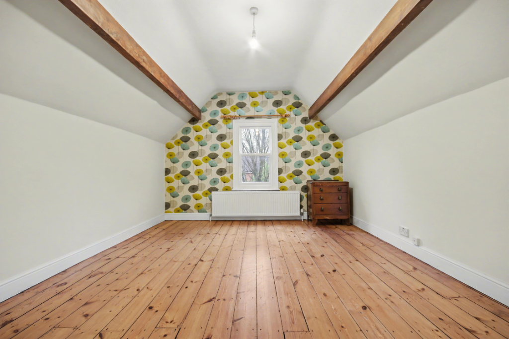 Located on the second floor, is this highly attractive room with exposed beams and wooden floors. A double-glazed, handmade wooden frame window looks out over the front of the property. There's a sink in the room and a convenient storage area at the opposite end, primed for an ensuite conversion. Further loft storage is accessed from this room at floor level (rather than via a ceiling hatch), providing versatile storage. An attractive feature wall with patterned wallpaper complements the rest of the room's décor. This was one of the vendor's favourite rooms.