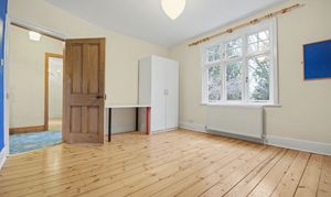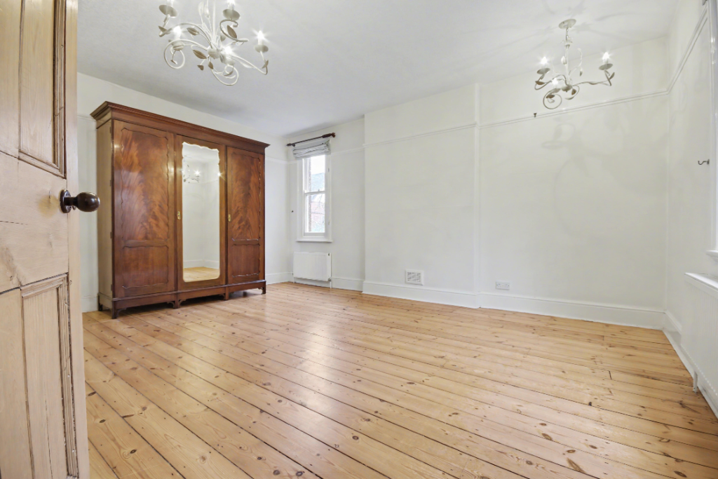 A large double room on the first floor with dual-aspect windows looking to the front and side. The front windows are handmade wooden frames with double glazing. Wooden flooring and neutral décor throughout, with twin ceiling roses for lighting. The size of this room offers real potential to add an ensuite.