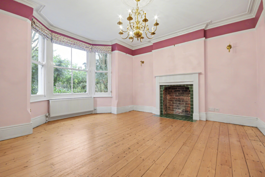 Previously used as the "piano room", this is the second of three reception rooms and larger than average. Features wooden flooring, a fireplace, and a bay window looking out to the front of the property. Ceiling and wall lights, with a chandelier currently in place. Accessed from the main entrance hallway.