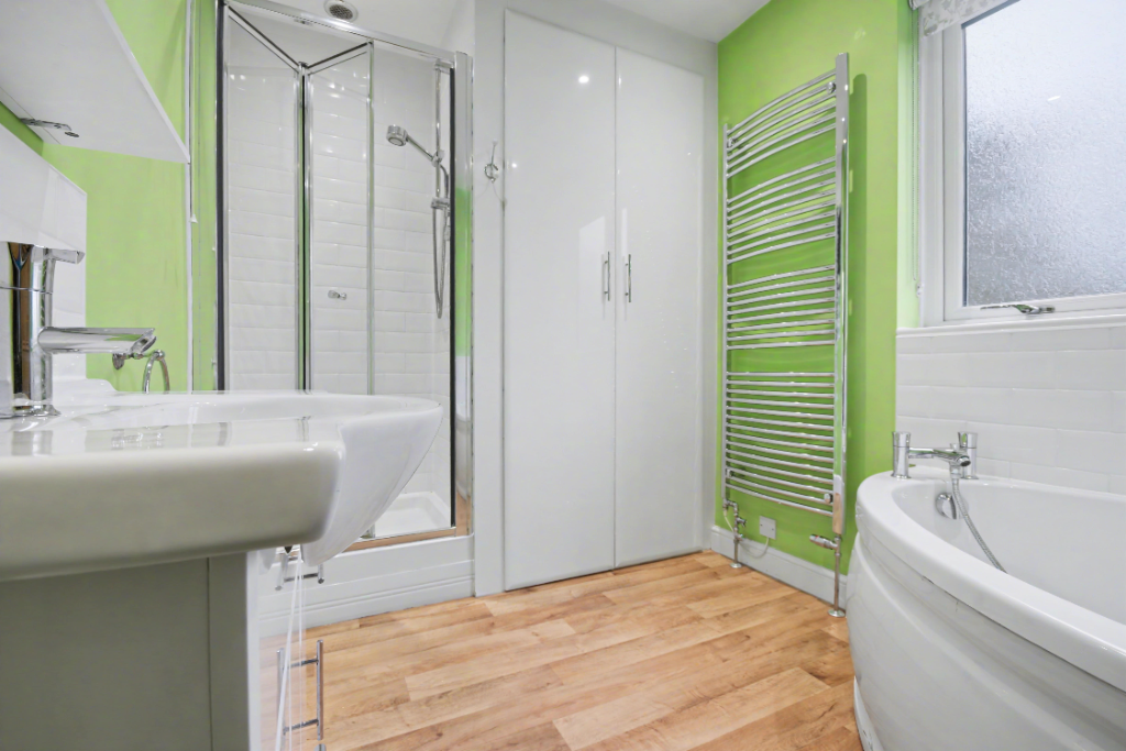 A good-sized family bathroom featuring a corner bath, vanity sink unit with white tile splashback, mixer tap, and three storage cupboards plus two drawers. Separate shower and additional built-in storage in the room. Full-height heated towel rail.