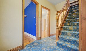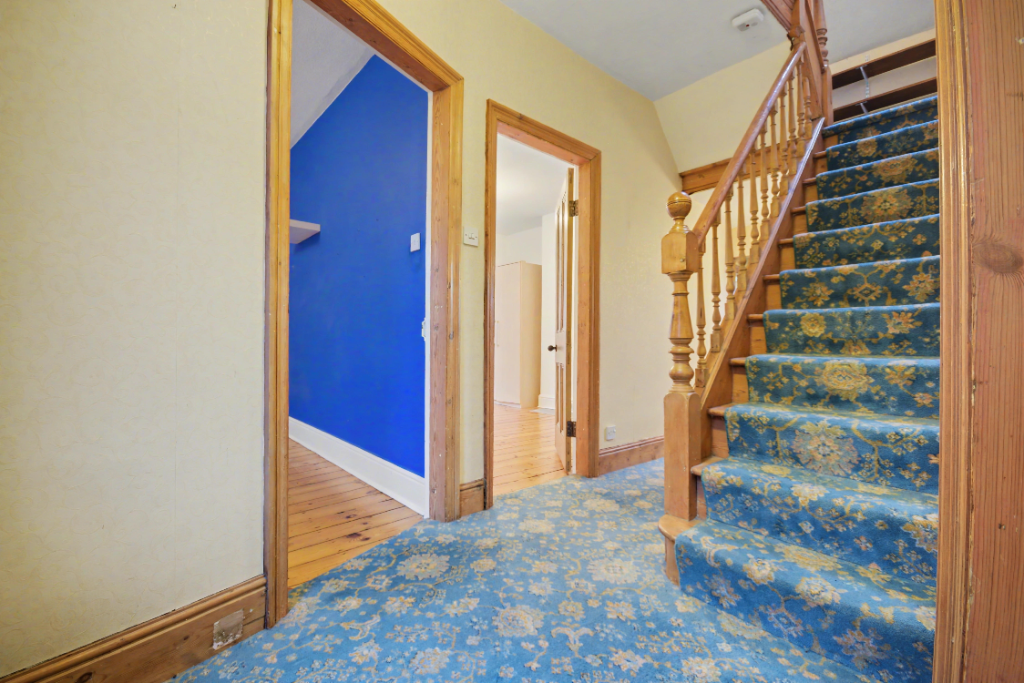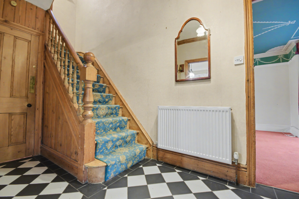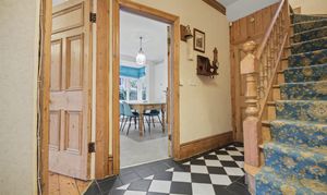 The entrance hallway is tiled with striking chessboard black and white flooring. Features natural wood skirting and architraves, with a wooden staircase leading to the first floor. Provides access to three reception rooms and the ground floor WC.