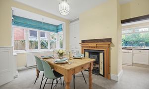 The ground floor begins with the entrance hallway, which features striking black-and-white chessboard tiled flooring and leads to three reception rooms. The living room is larger than average with intricate mouldings to the ceiling, a woodburning stove, a bay window to the front, and UPVC patio doors providing garden access. The dining room is another generous space with a fireplace and bay window, while the adjacent breakfast room flows openly from the kitchen. The current owners considered combining these two rooms into one large open-plan kitchen-diner, which is certainly worth discussing at your viewing.
