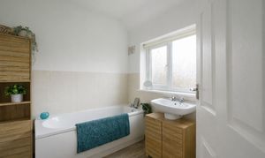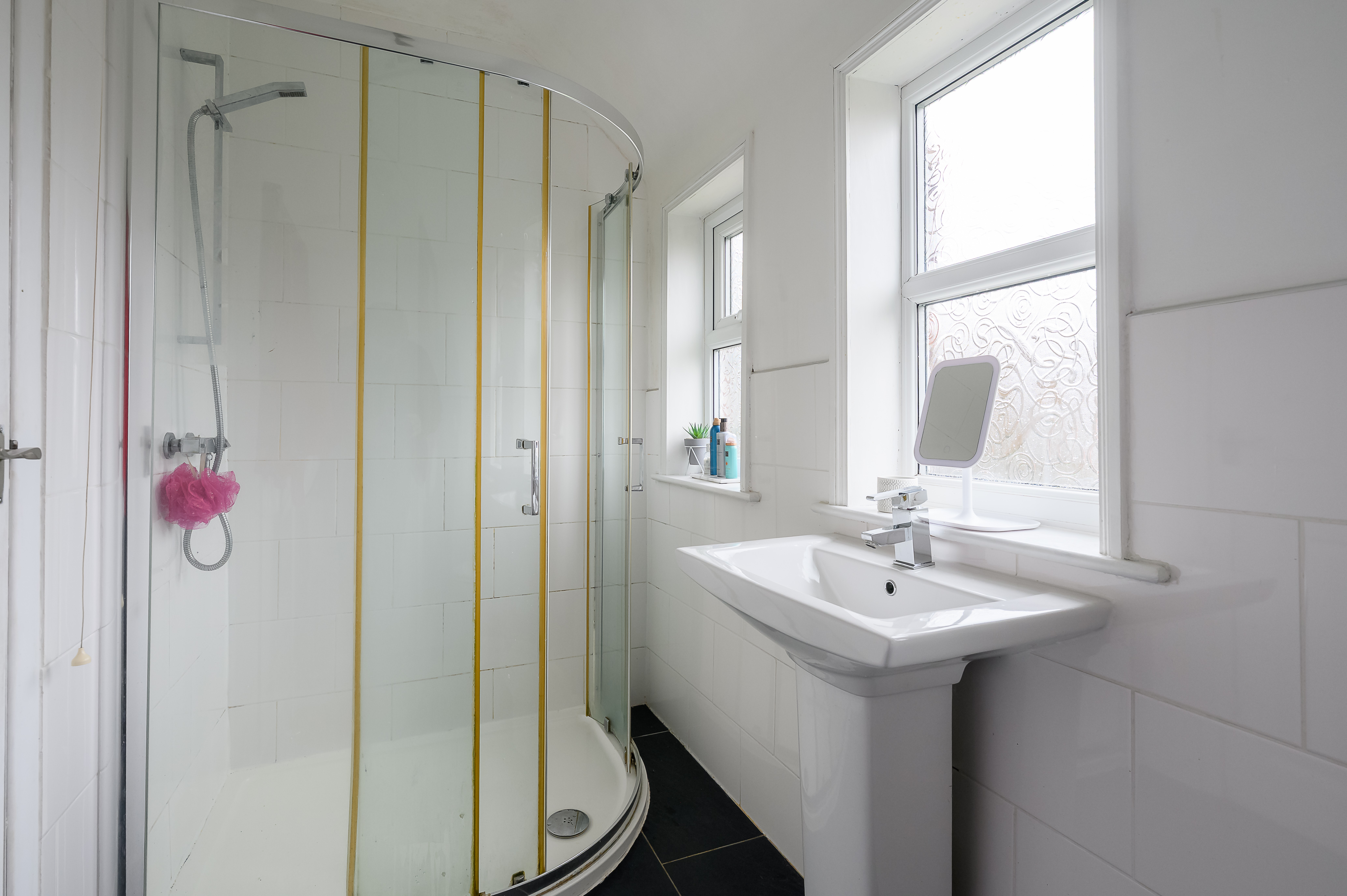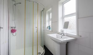 Serving bedroom 2 & 3 the house bathroom features a large corner shower with mains-fed shower, pedestal wash hand basin and low-level WC. Three glazed windows to the rear allow plenty of natural light, creating an airy feel. Finished with large white wall tiles complemented by contrasting dark flooring. Chrome towel radiator completes the room.
