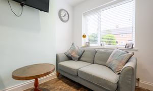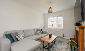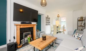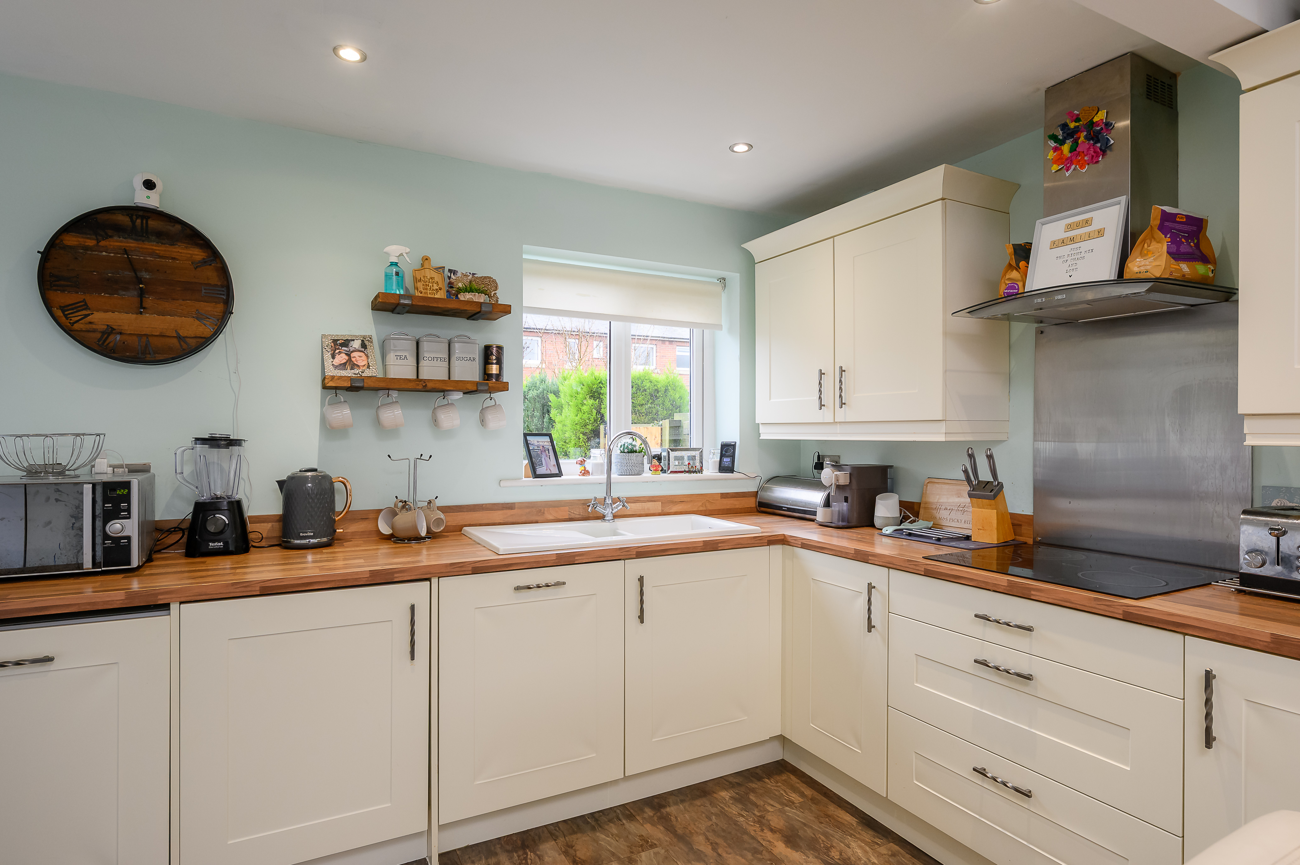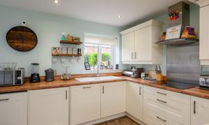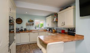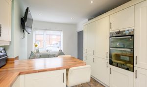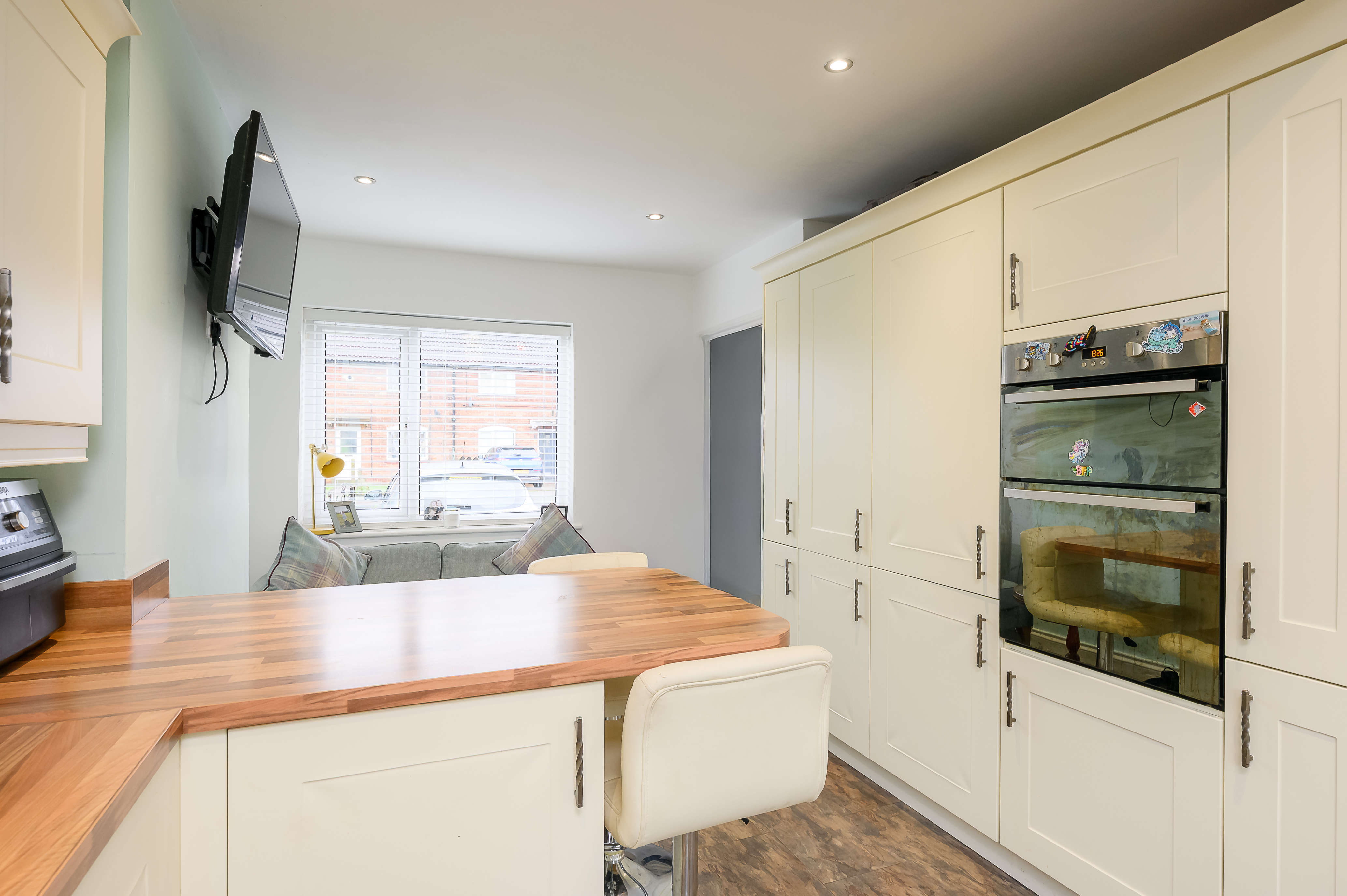 The kitchen has been thoughtfully opened up by the current vendors to create a more versatile and sociable space. Fitted with cream shaker-style cabinetry complemented by contrasting wood-effect worktops, the kitchen benefits from a range of integrated appliances including a washing machine, tumble dryer, dishwasher and fridge freezer. There is an electric hob with extractor hood above, a double eye-level electric oven and grill. An under-stairs storage cupboard provides additional practicality. Currently arranged with a sofa, the room offers ample space for a dining table if preferred. A door from the kitchen leads directly out to the rear garden.