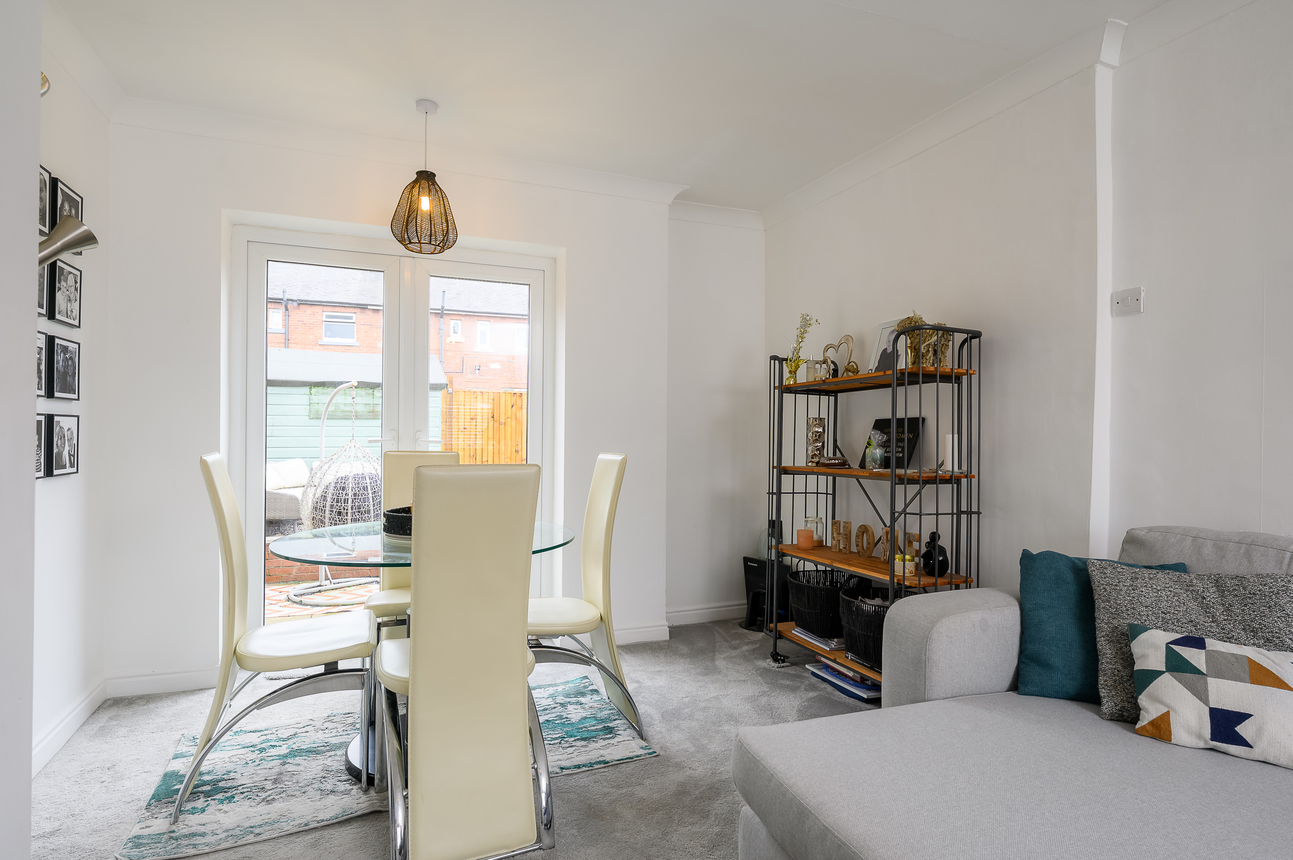 The spacious living/dining room is a fantastic dual-aspect room with a window to the front and double doors opening onto the rear garden, allowing plenty of natural light. The room comfortably accommodates a formal dining area to the rear alongside a generous seating arrangement and additional freestanding furniture. The focal point of the room is the gas fire with wooden surround and black tiled hearth. Grey carpeting and dark green accent walls complete the stylish finish.