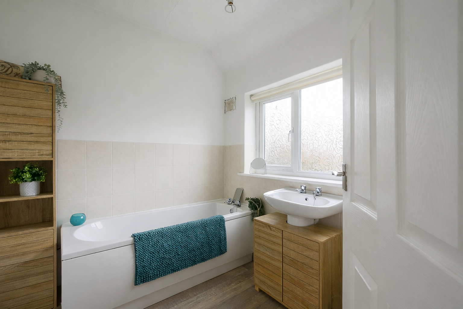 The primary bedroom is a generous double with a window to the front and an over-stairs storage cupboard housing the gas-fired combi boiler. The en-suite bathroom features beige wall tiling, wood-effect flooring, a bath, pedestal wash basin and low-level WC.