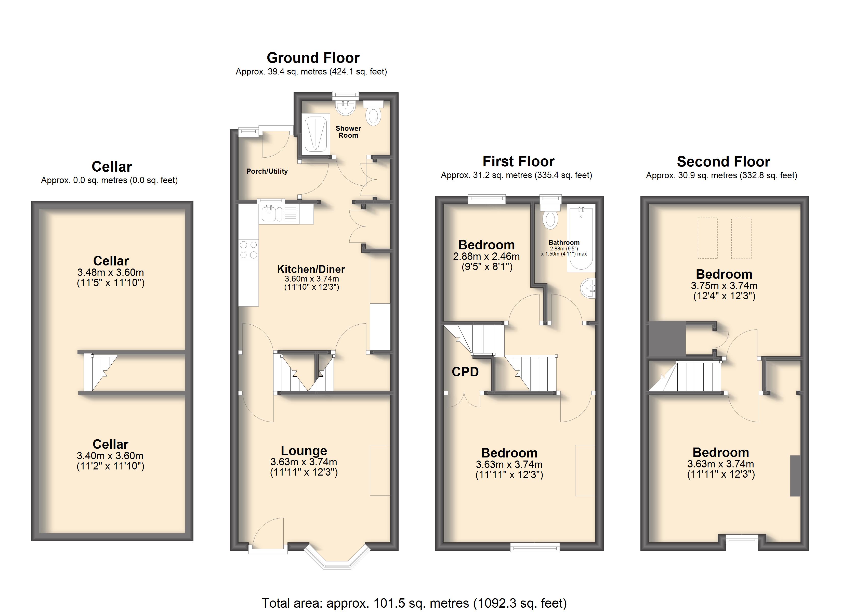 Ample living and dining space on the ground floor includes a beautifully appointed lounge which is flooded with natural light, alongside a fitted kitchen diner incorporating useful storage and access to the ground floor shower room and porch/utility space. The bedrooms are split across two levels and are all well-proportioned. Two good-sized first-floor bedrooms and a three-piece bathroom are well-complemented by two further double bedrooms on the second floor - both of which have storage space. To the rear is a low-maintenance landscaped garden, with a south-facing paved patio area, artificial lawn and colourful borders - a perfect spot for a morning coffee or summer evening BBQ. The property had a new roof in August 2025.