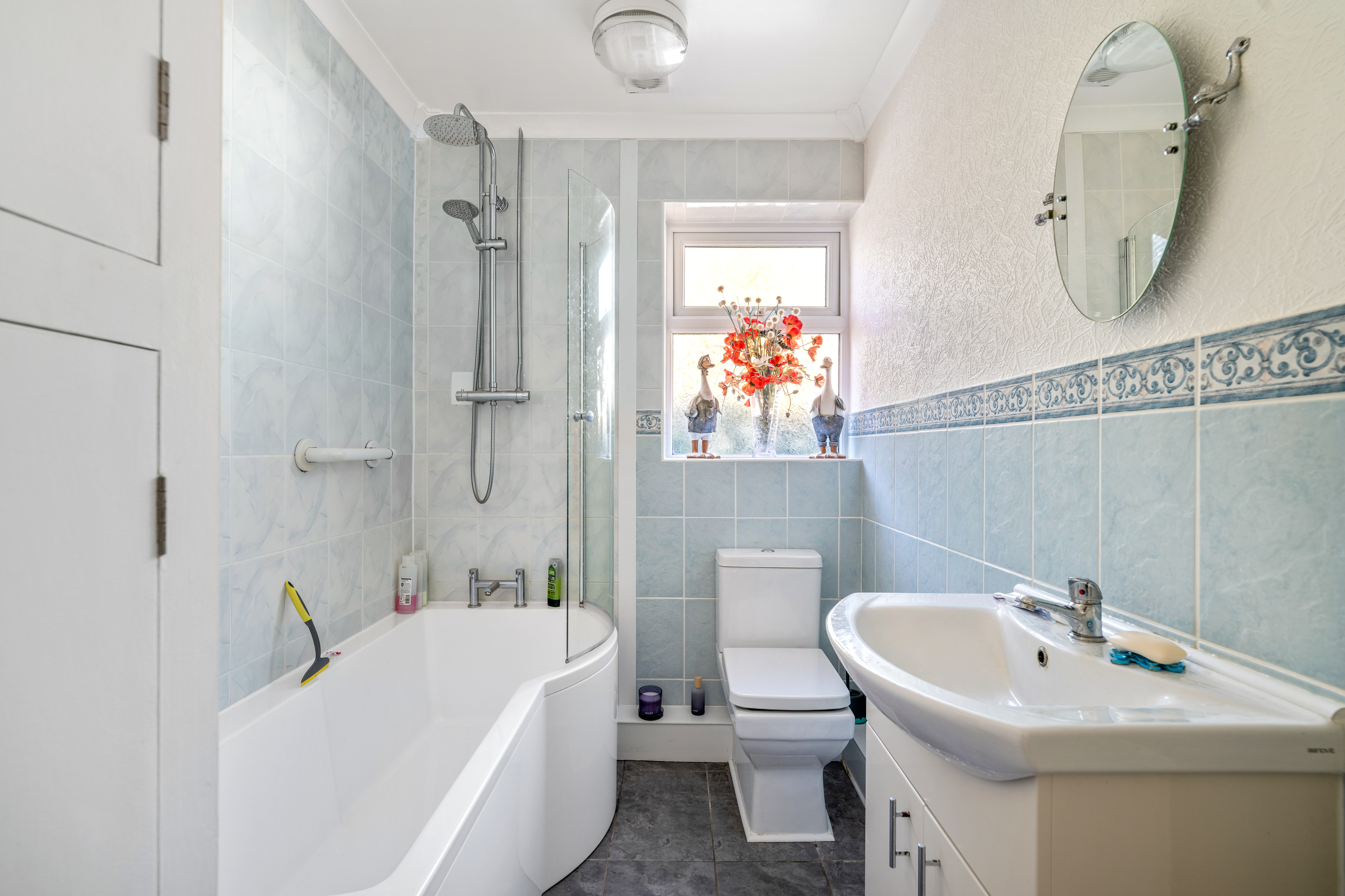 - Family bathroom: Integrated storage, bath with shower overhead, toilet, and basin