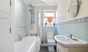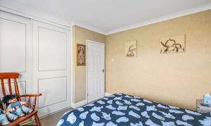 Both bedrooms are generous doubles, each with bay windows that flood the rooms with light. The master bedroom also benefits from built-in storage. The family bathroom is fitted with integrated storage, a bath with shower overhead, a toilet, and a basin, ensuring practicality and comfort.