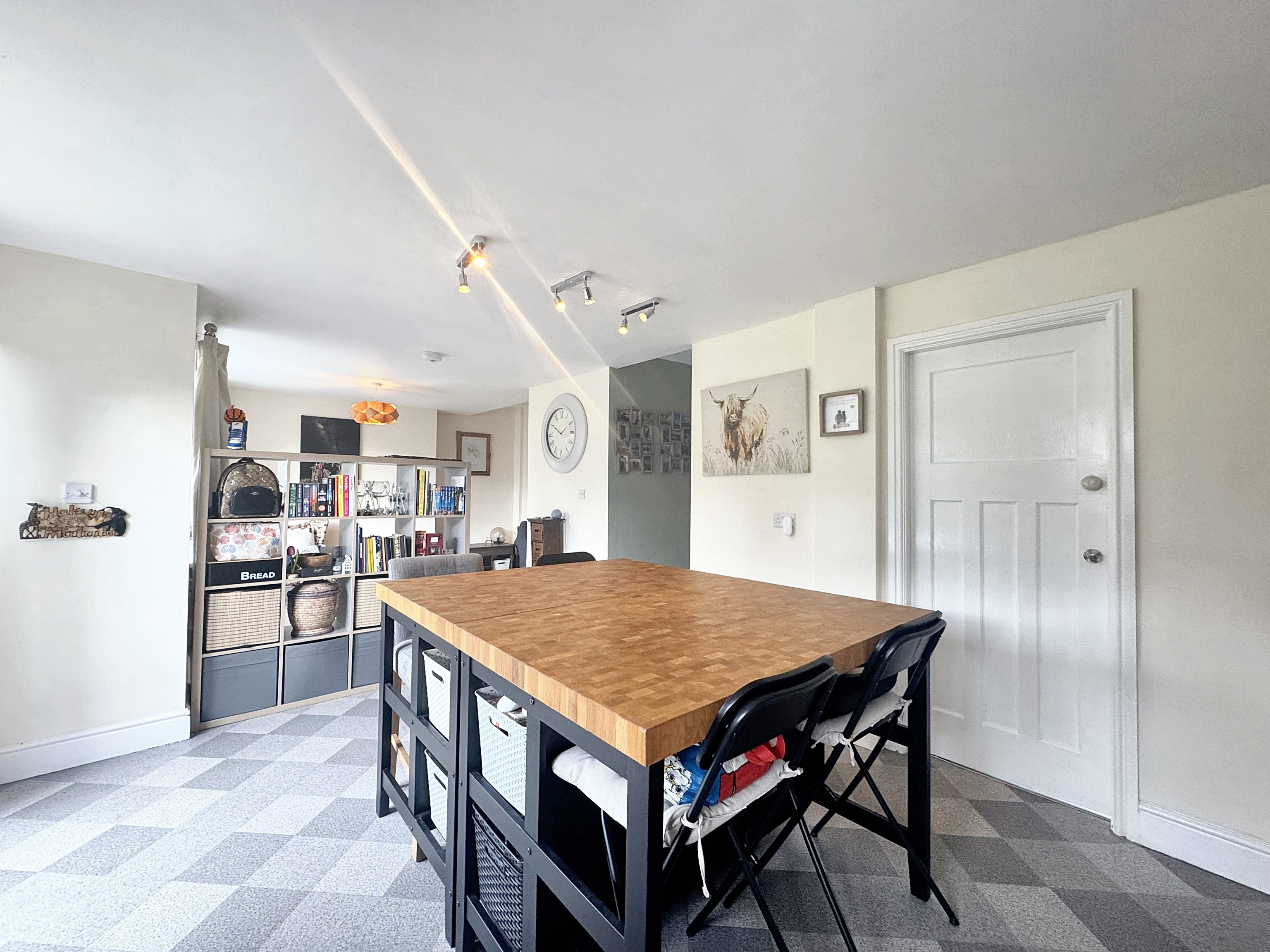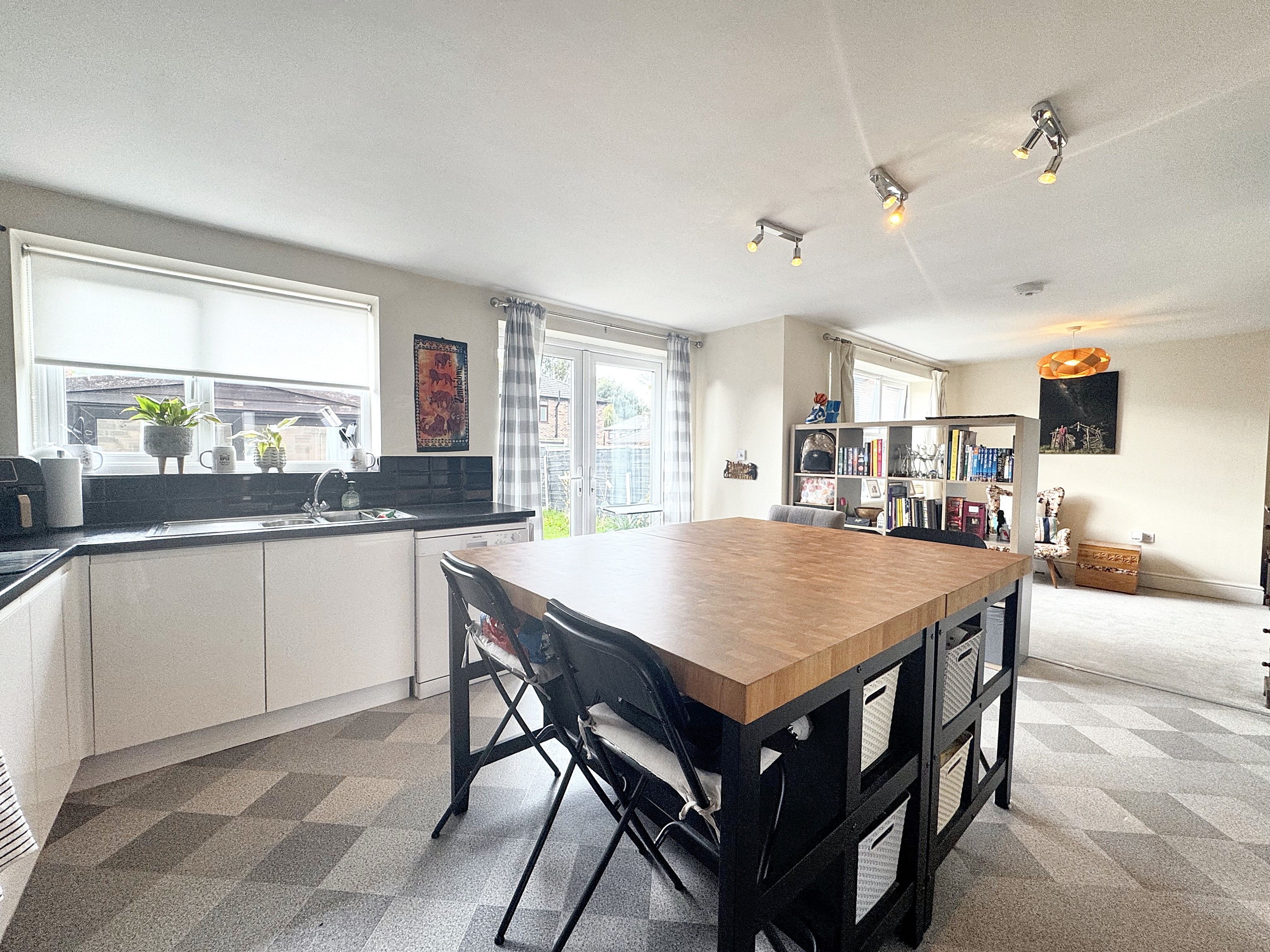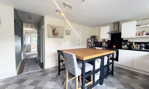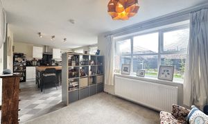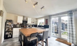 The open plan kitchen/dining room benefits from two windows to the rear elevation and French patio doors leading into the rear garden. The kitchen is fitted with a range of matching wall and base units with integrated oven, hob and extractor. There is plumbing for a dishwasher and space for a fridge freezer. Open through to another reception sitting room.