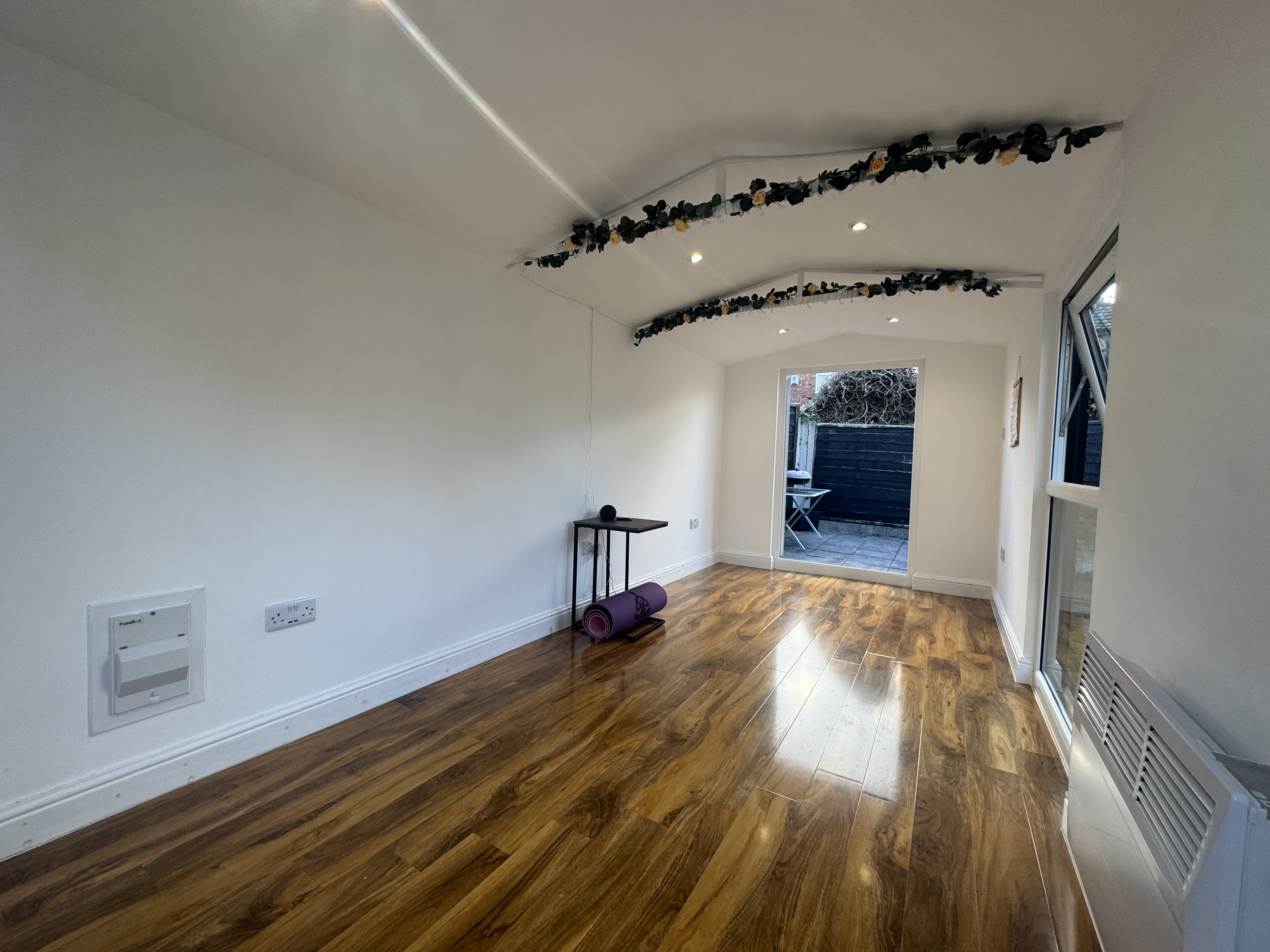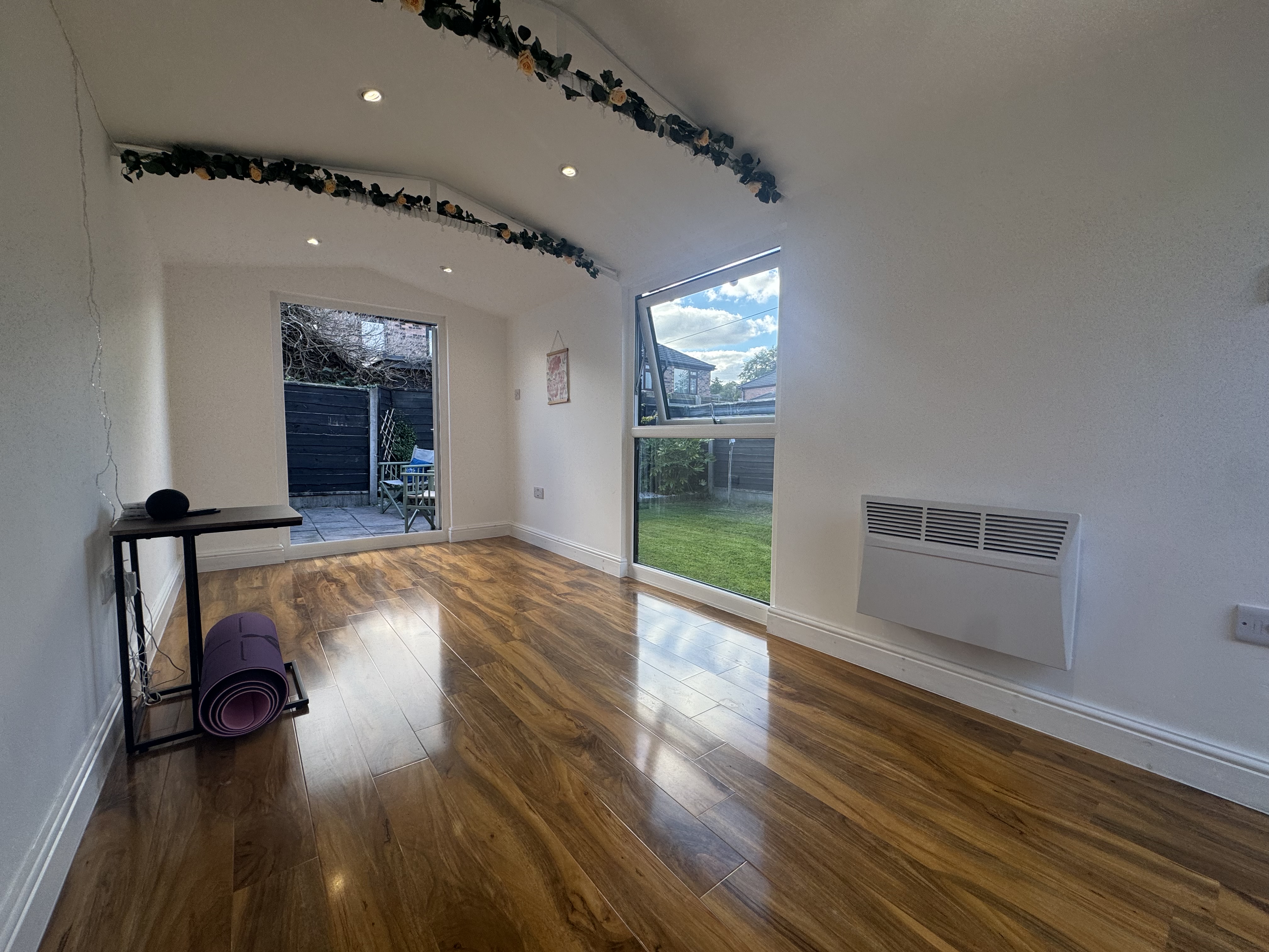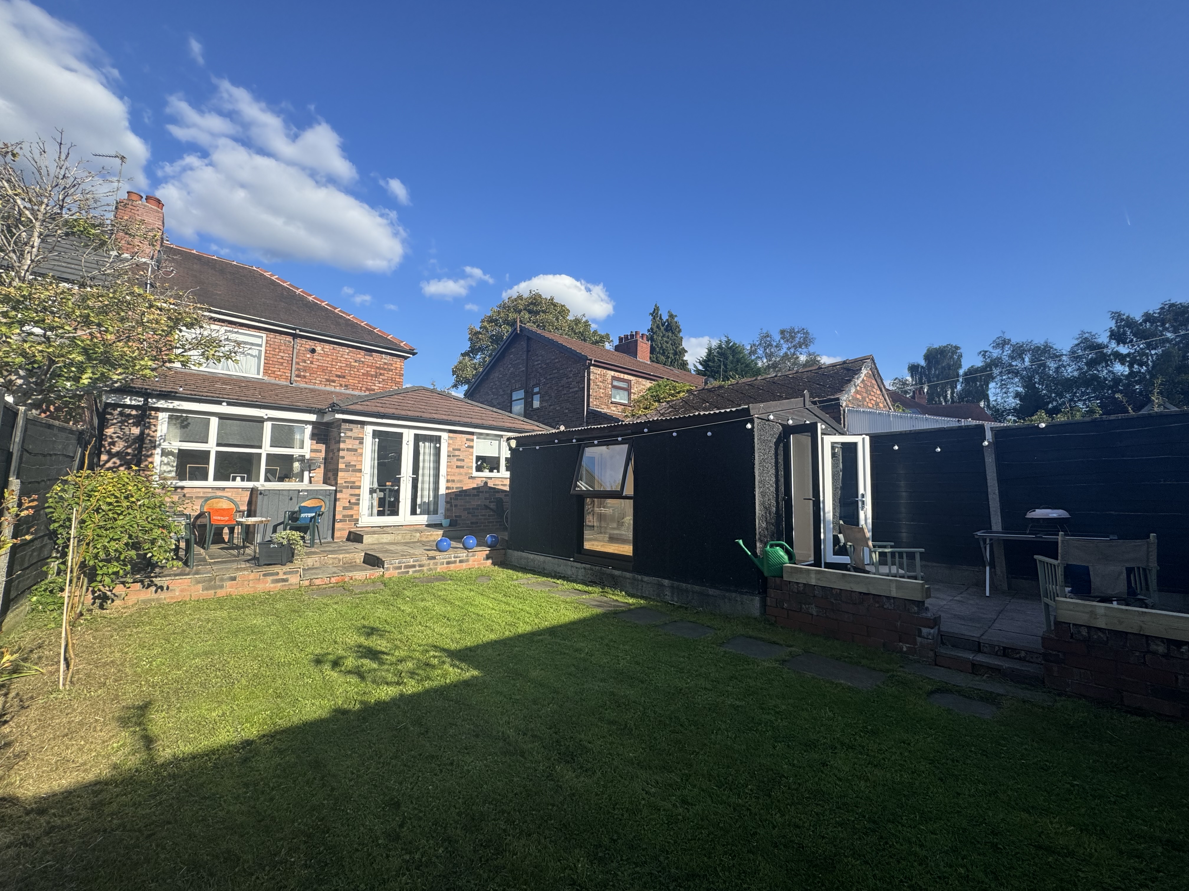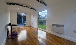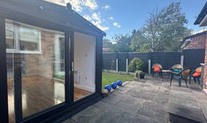 The private rear garden offers a serene escape from the hustle and bustle of daily life. Enhancing the outdoor experience, a modern Garden Room stands ready for versatile use, whether as a tranquil retreat or home office.