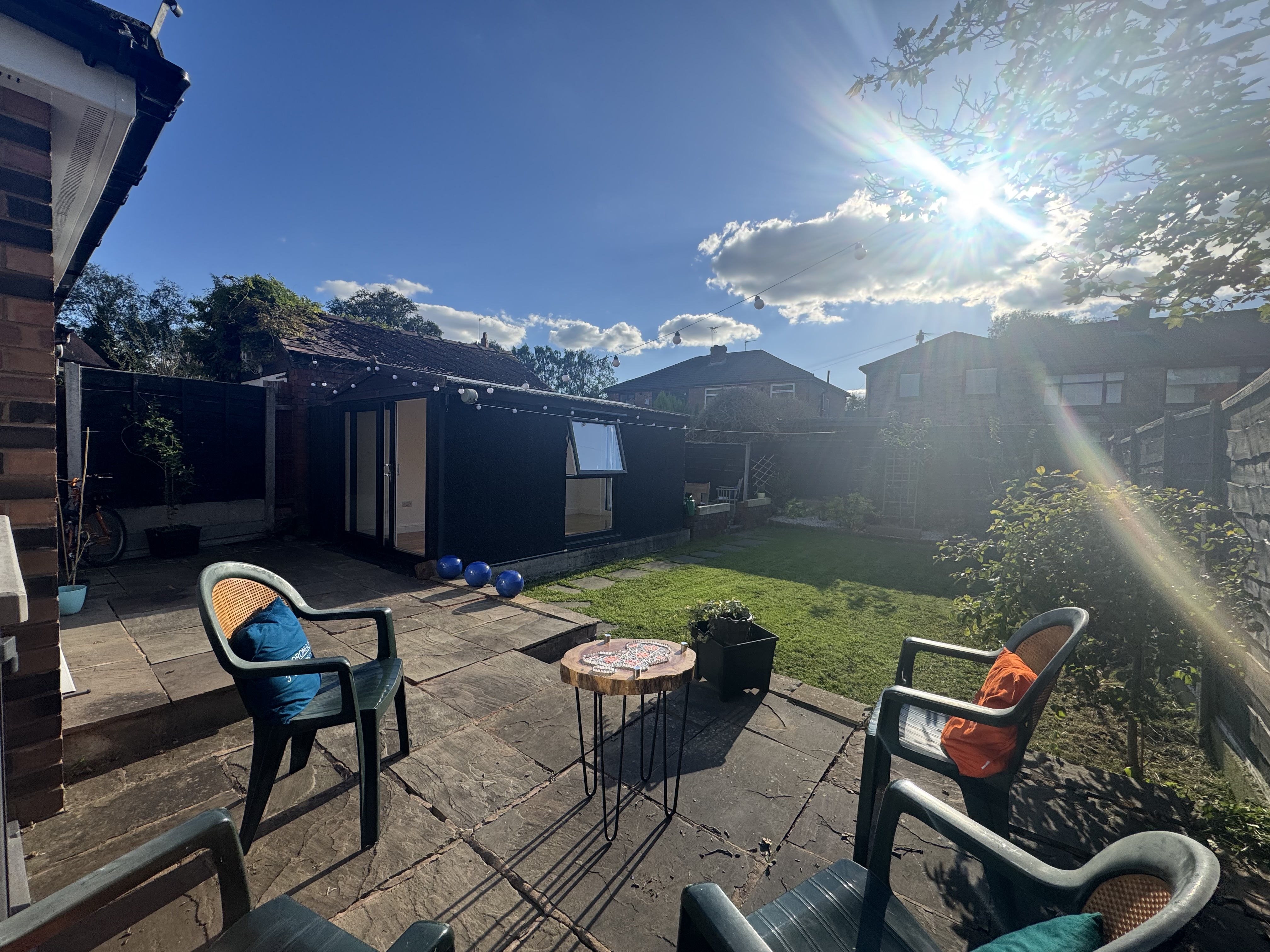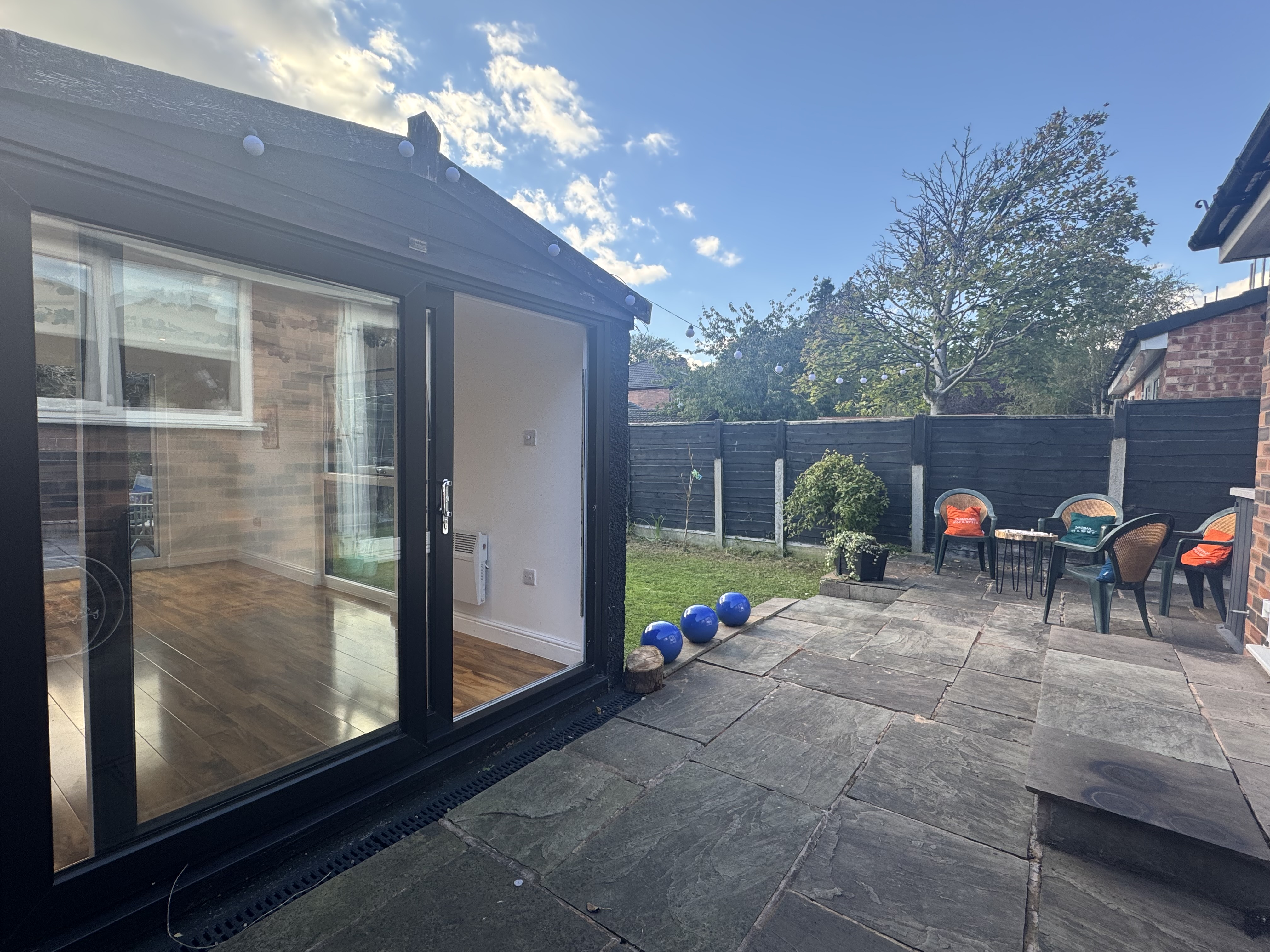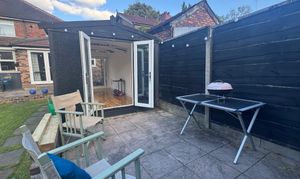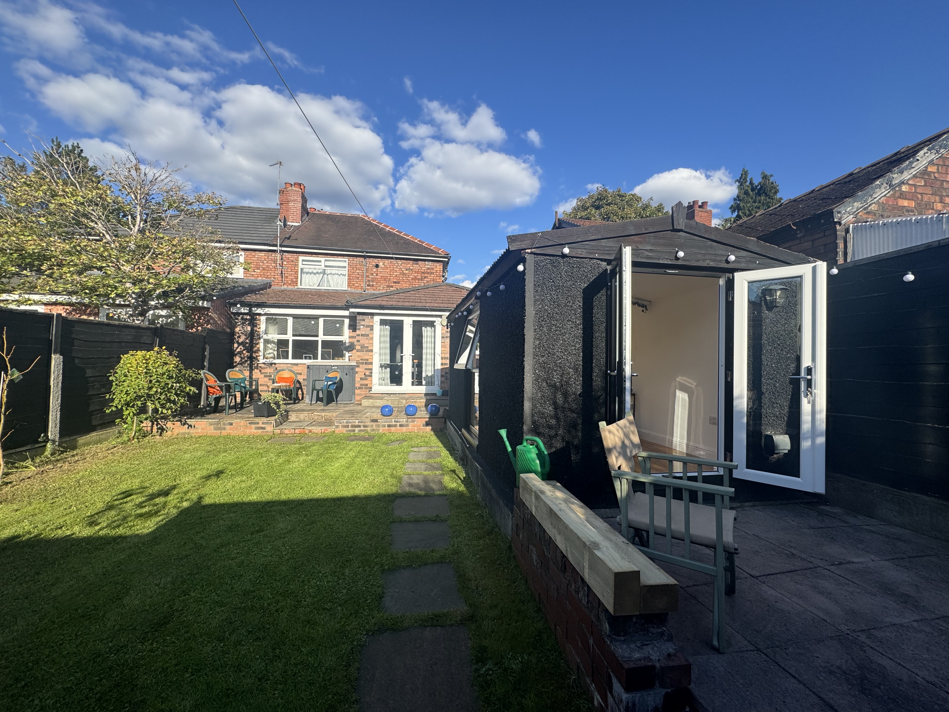 Private and South West facing rear garden with paved patio and a detached, brand new garden room/office/hobby space.