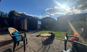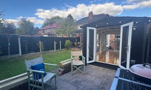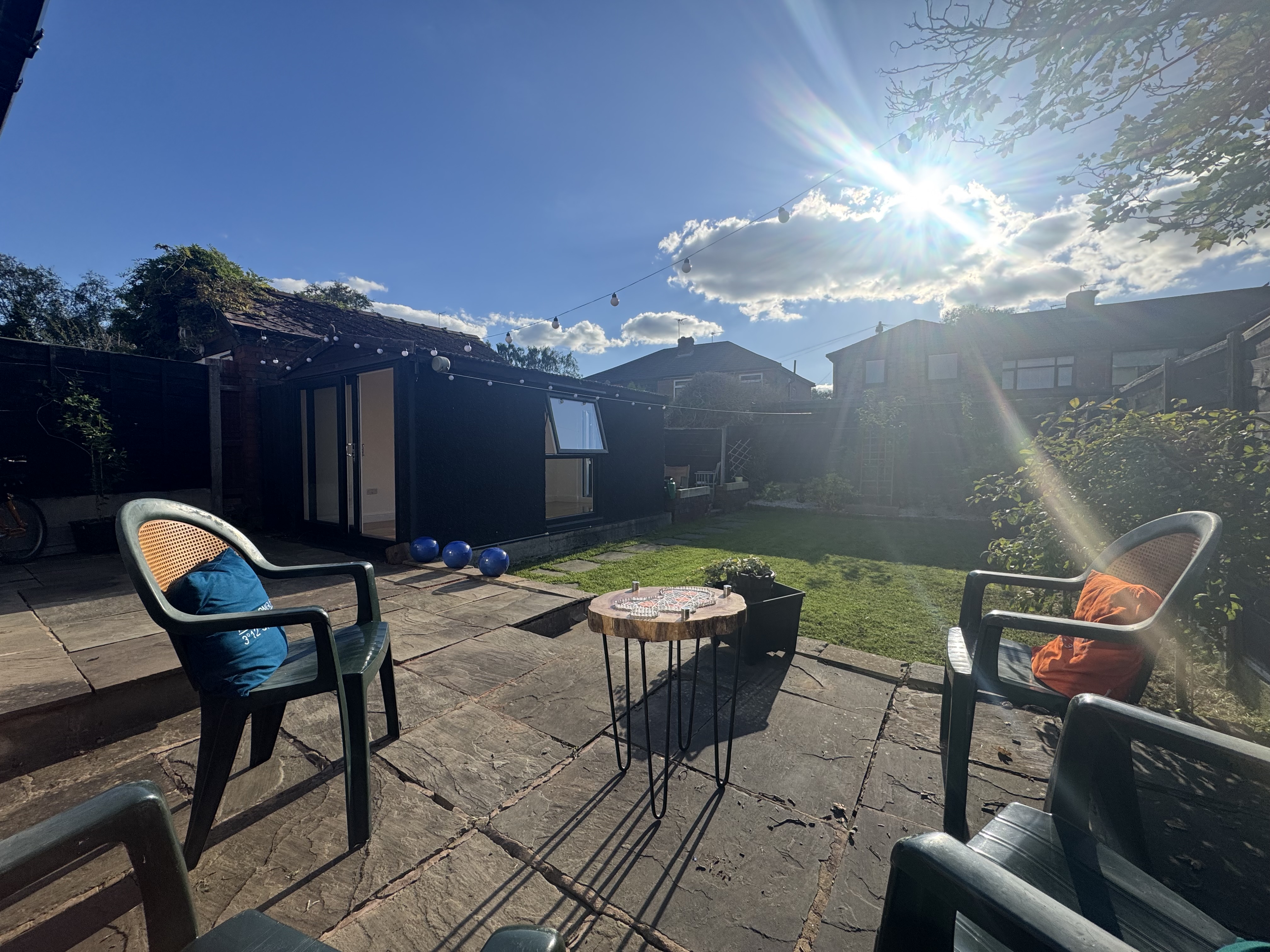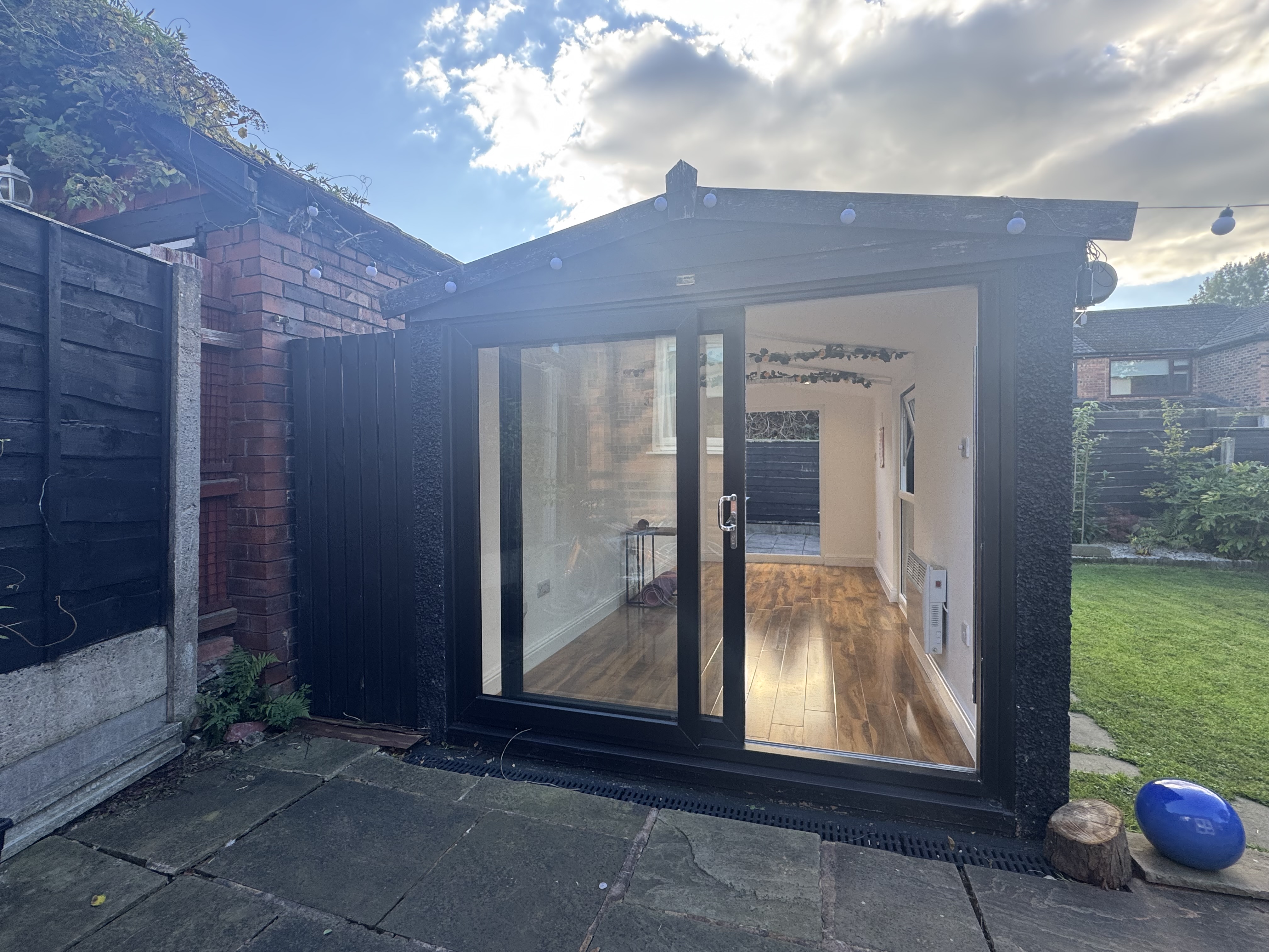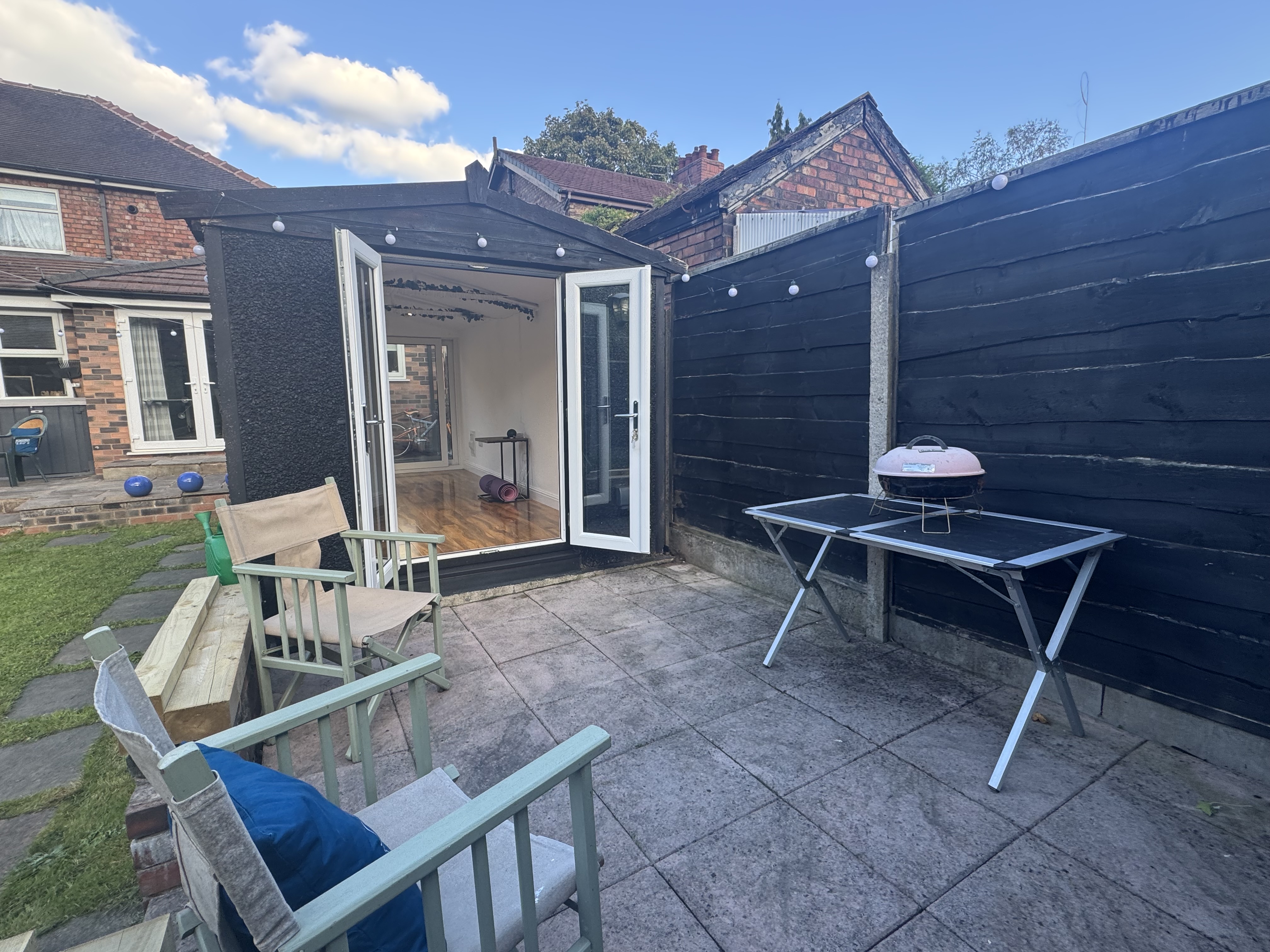 Private and South West facing rear garden with paved patio and a detached, brand new garden room/office/hobby space.