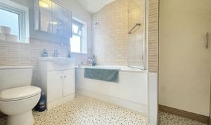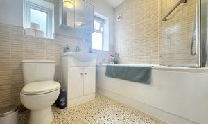 Family bathroom fitted with a low level WC, vanity unit hand wash basin and bath with shower. Two frosted windows to the side elevation.