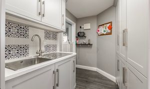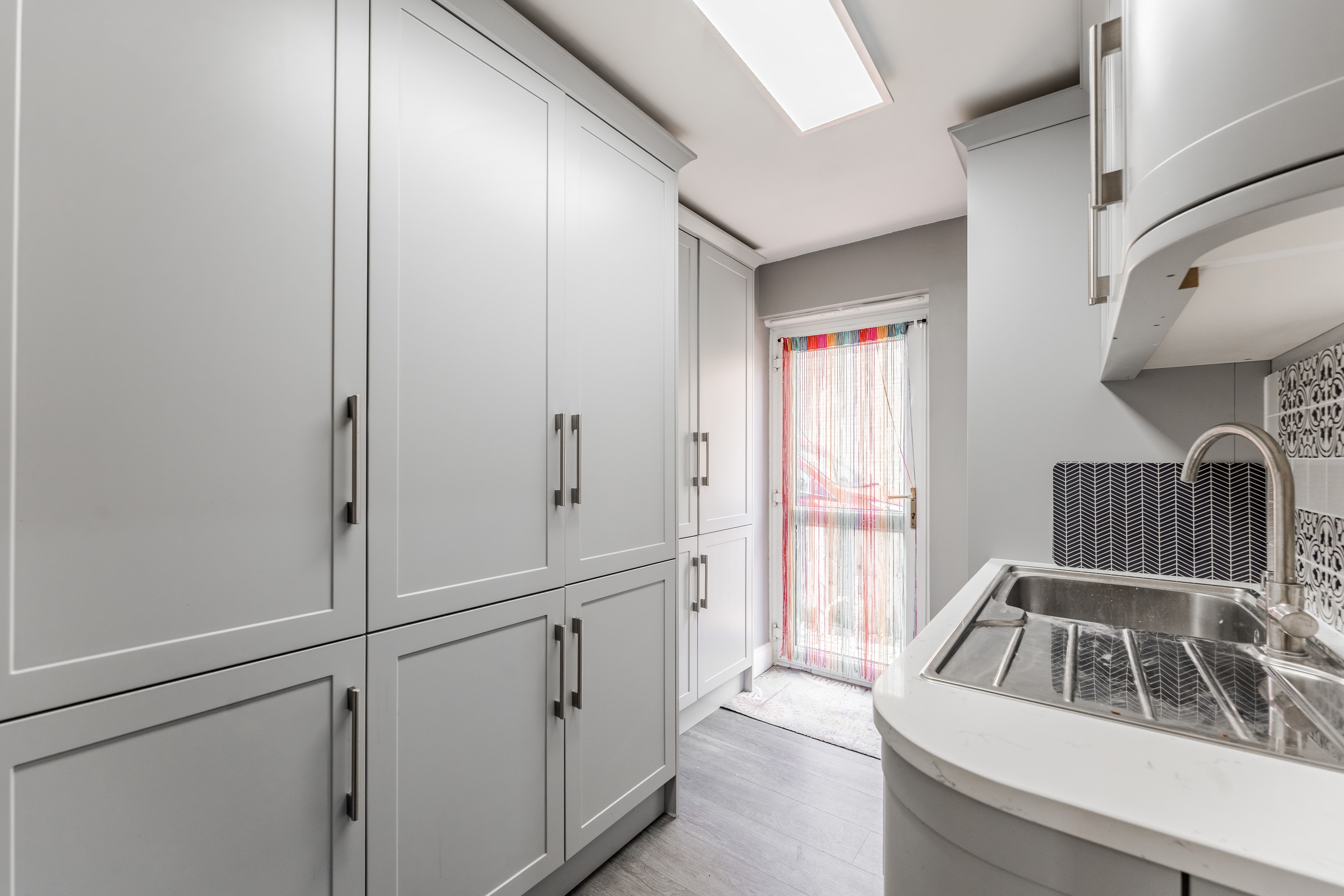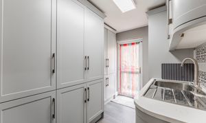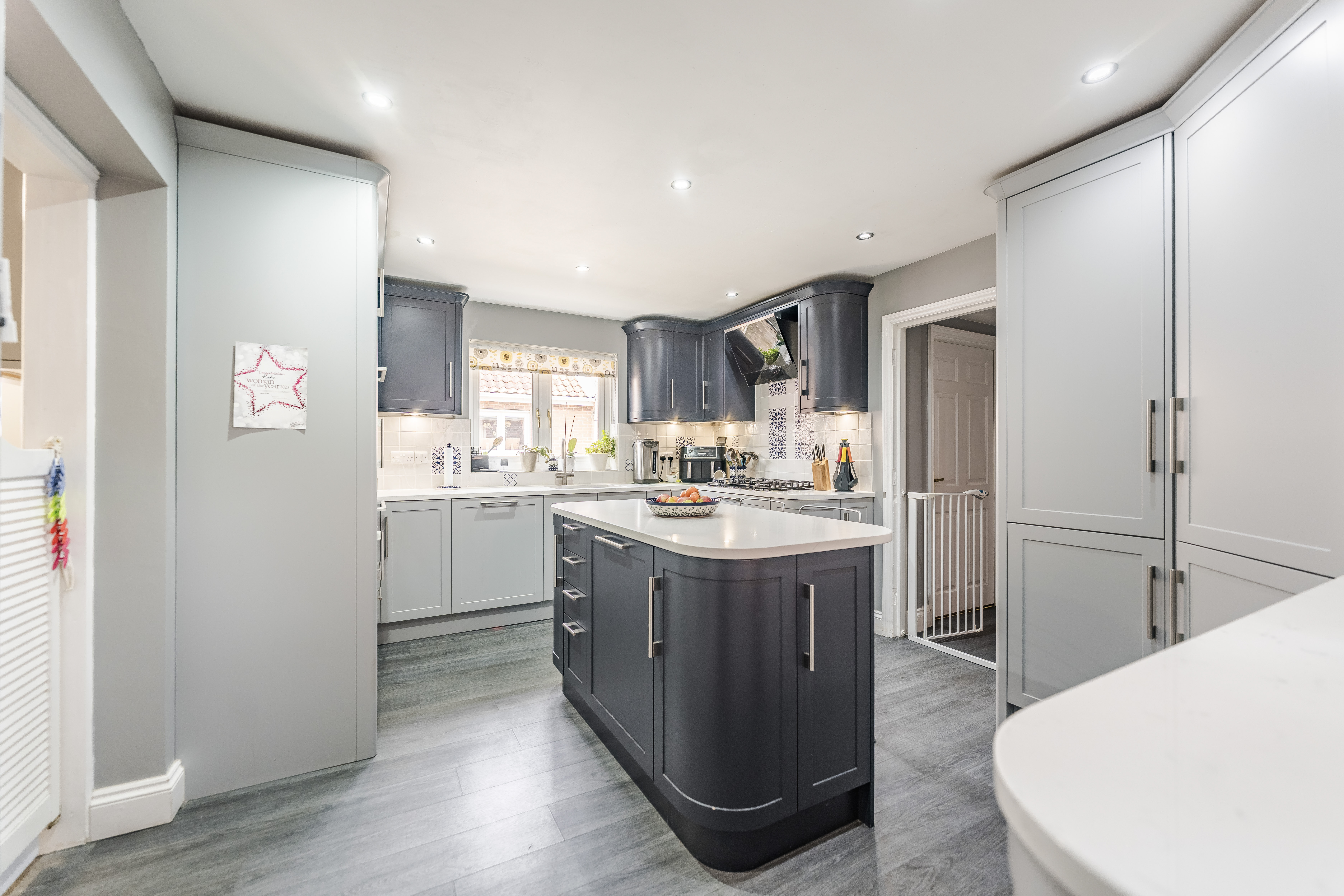 - Contemporary kitchen equipped with quality cabinetry, a central island, integrated appliances and a functional utility room