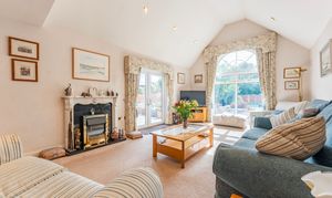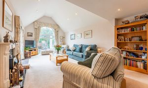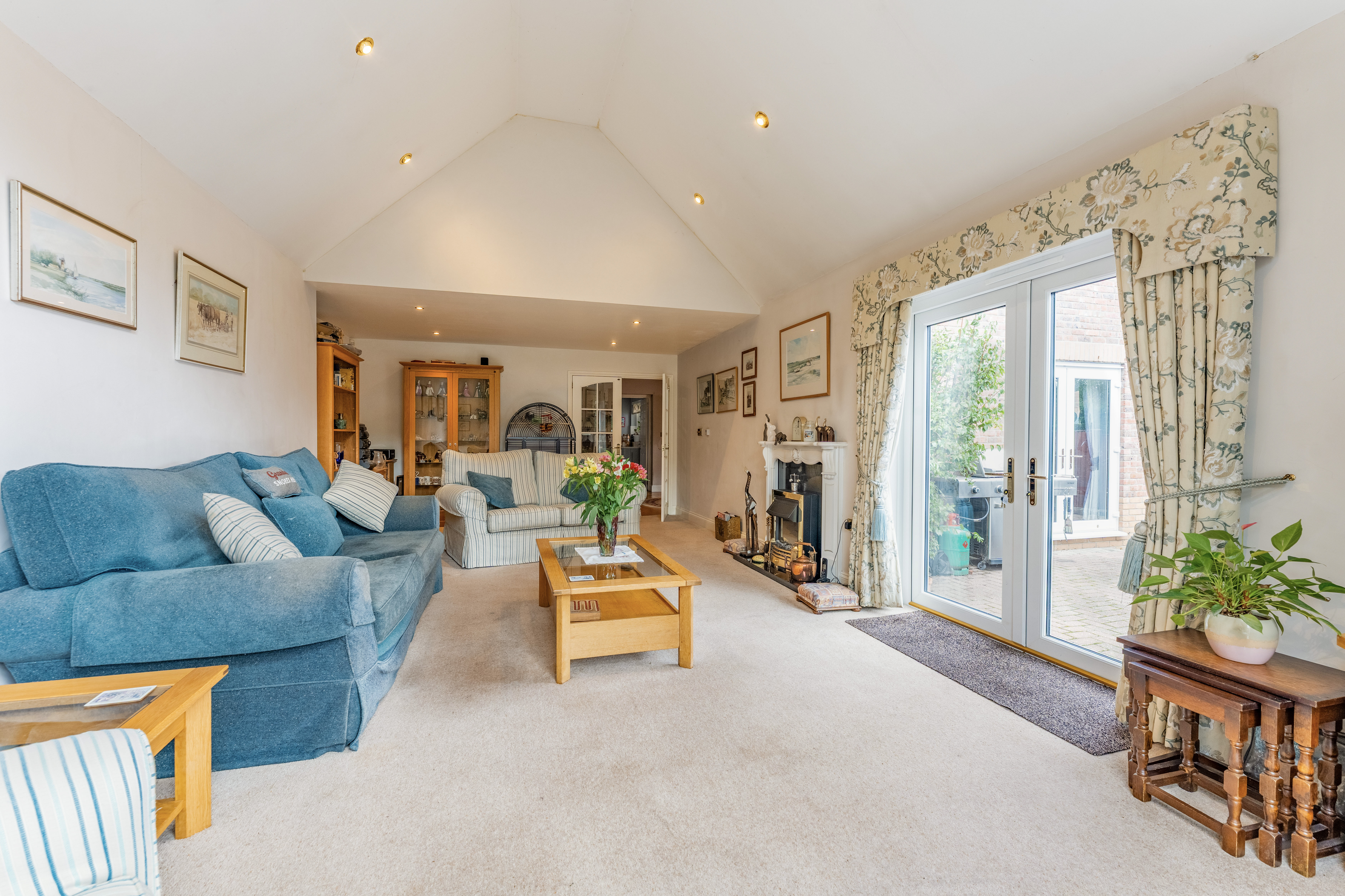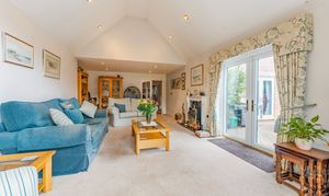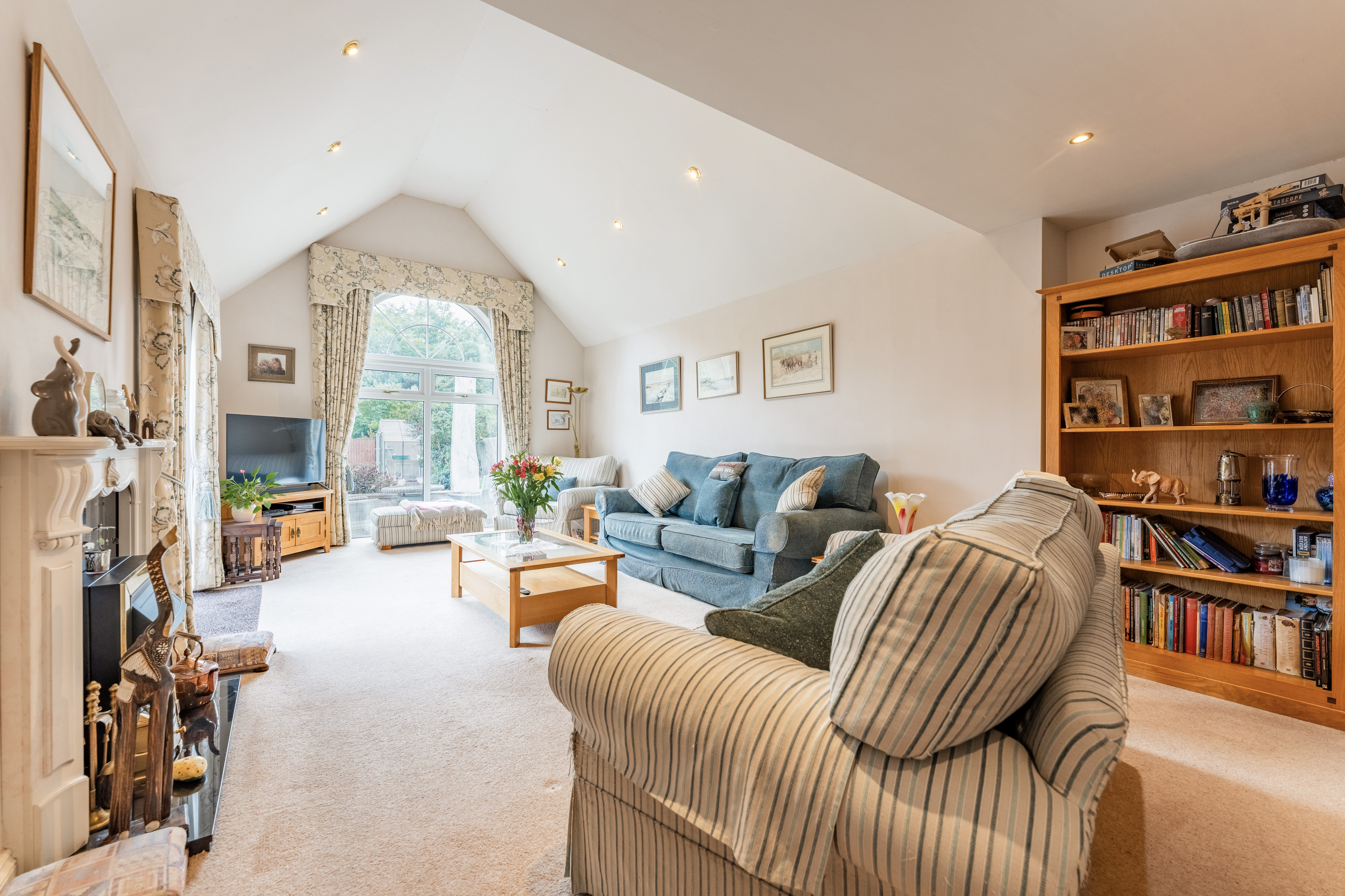 - Impressive dual aspect vaulted sitting room with a tall arched window and French doors out to the garden