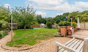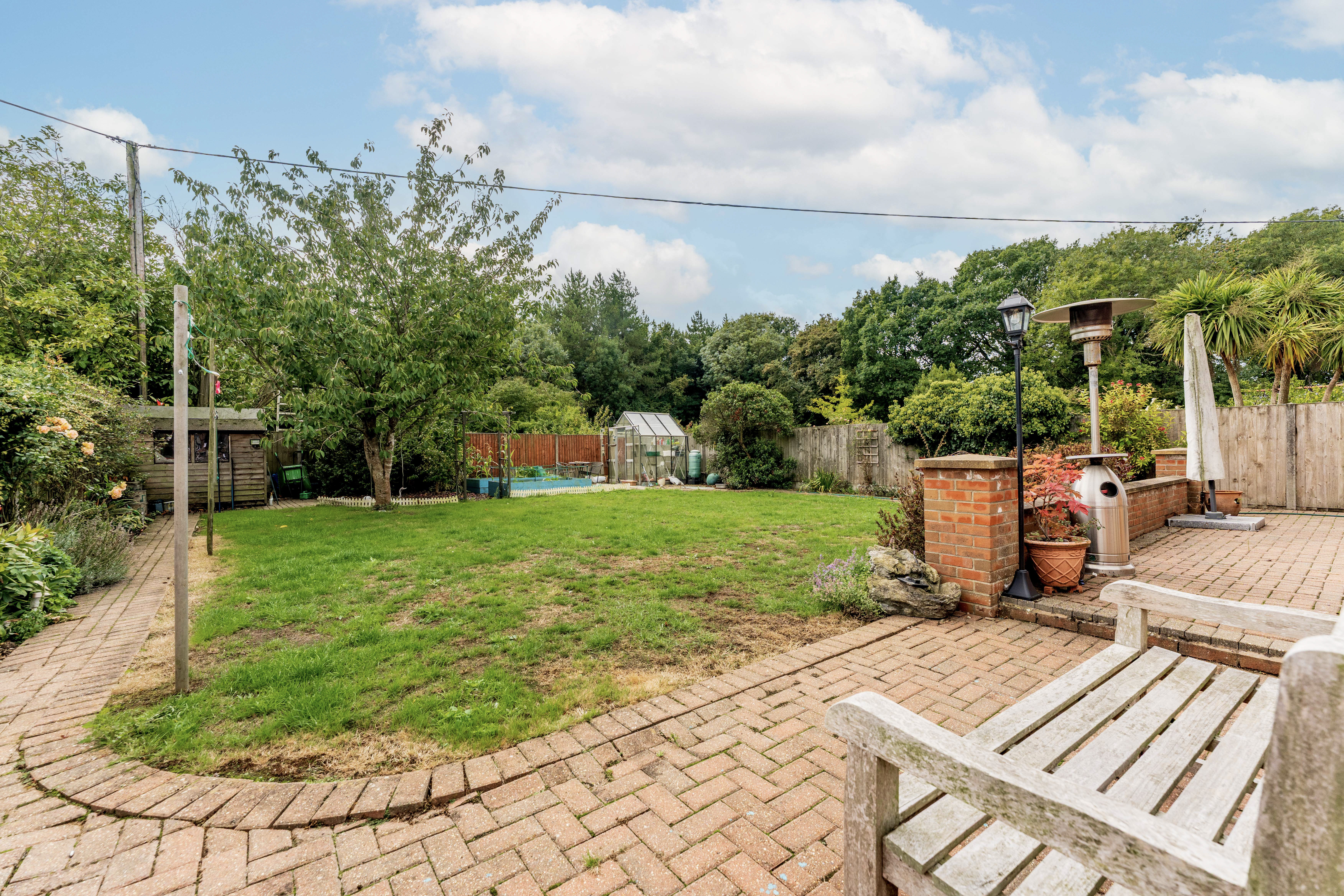 - A private, 78ft south-facing garden featuring a patio terrace for seating arrangements, a maintained lawn, a greenhouse and a timber storage shed