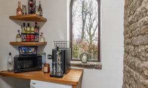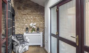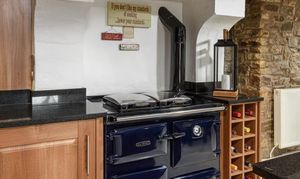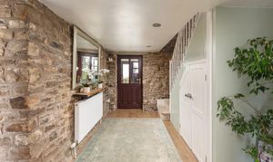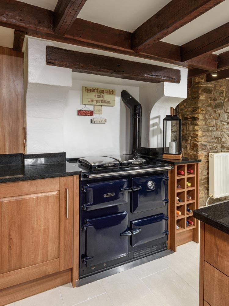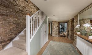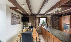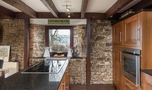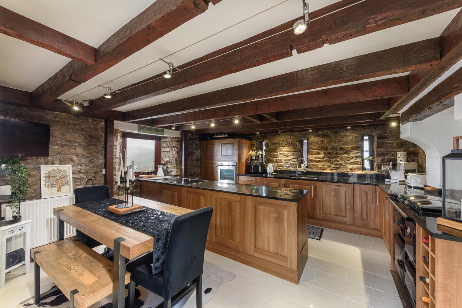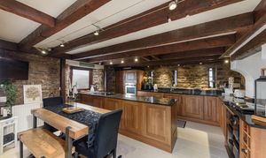 Everyday access is via a generous entrance porch with a stone flagged floor, arched window and exposed stonework. Fitted shelving and timber worktop provide useful utility space with room for laundry appliances. A plumbed dog wash with spray attachment and floor drain makes muddy returns simple. From here, you step into the kitchen and dining room. Here, bespoke cabinetry and polished granite worktops are against exposed stone walls beneath deep stained beams. A long central island provides excellent preparation and serving space, while a Rayburn range oven is set within a recessed arch, gives a traditional focal point alongside the modern specification. There is also ample room for a large dining table set comfortably beside the island, ideal for relaxed weekday dinners and easy weekend entertaining.