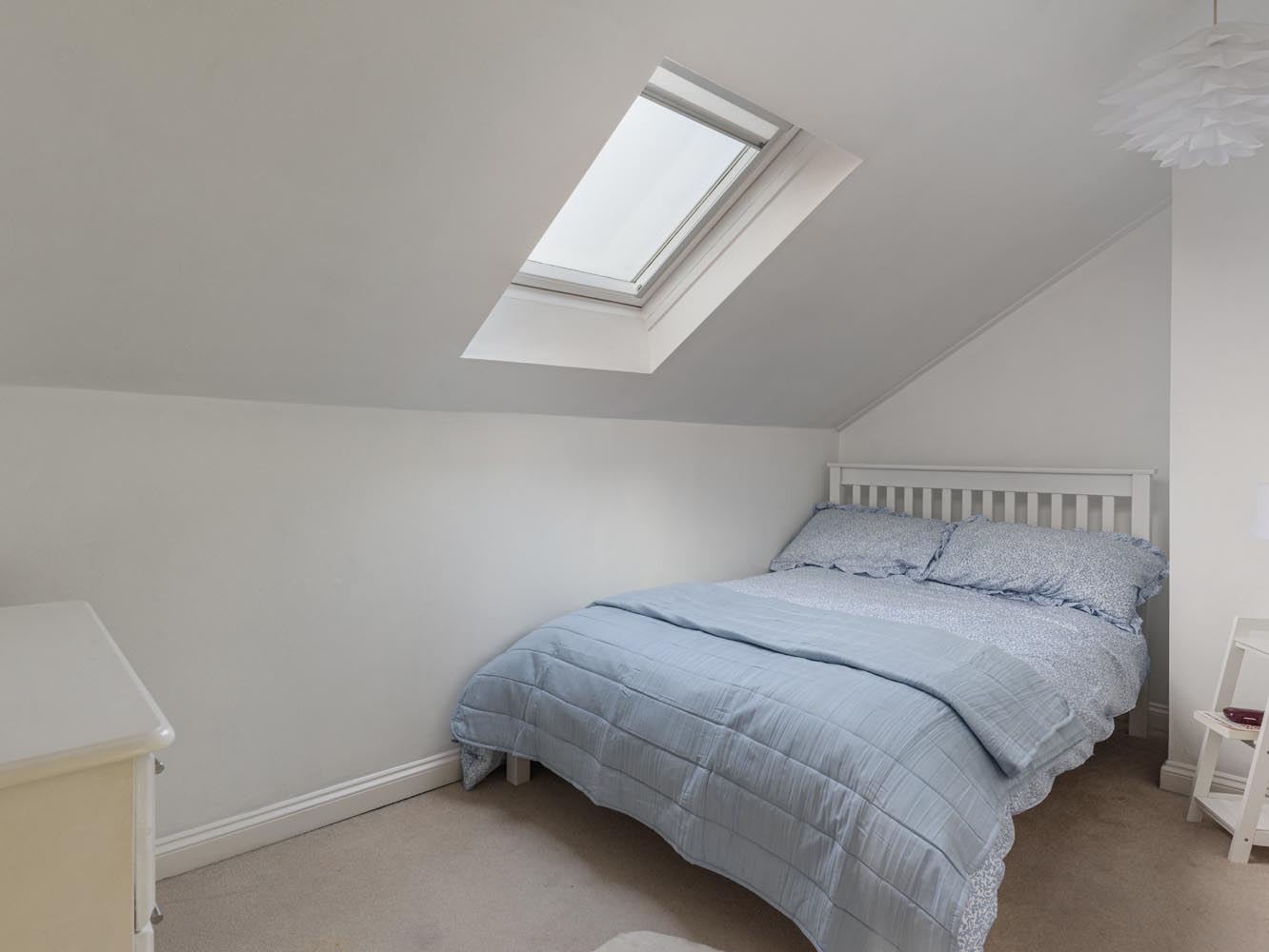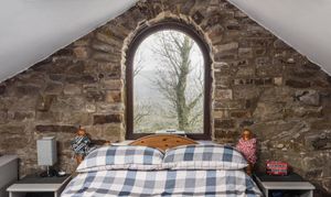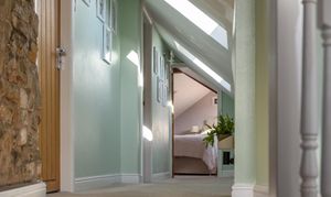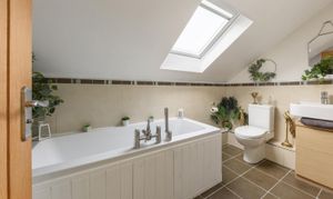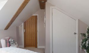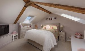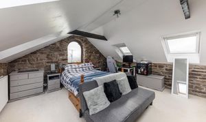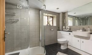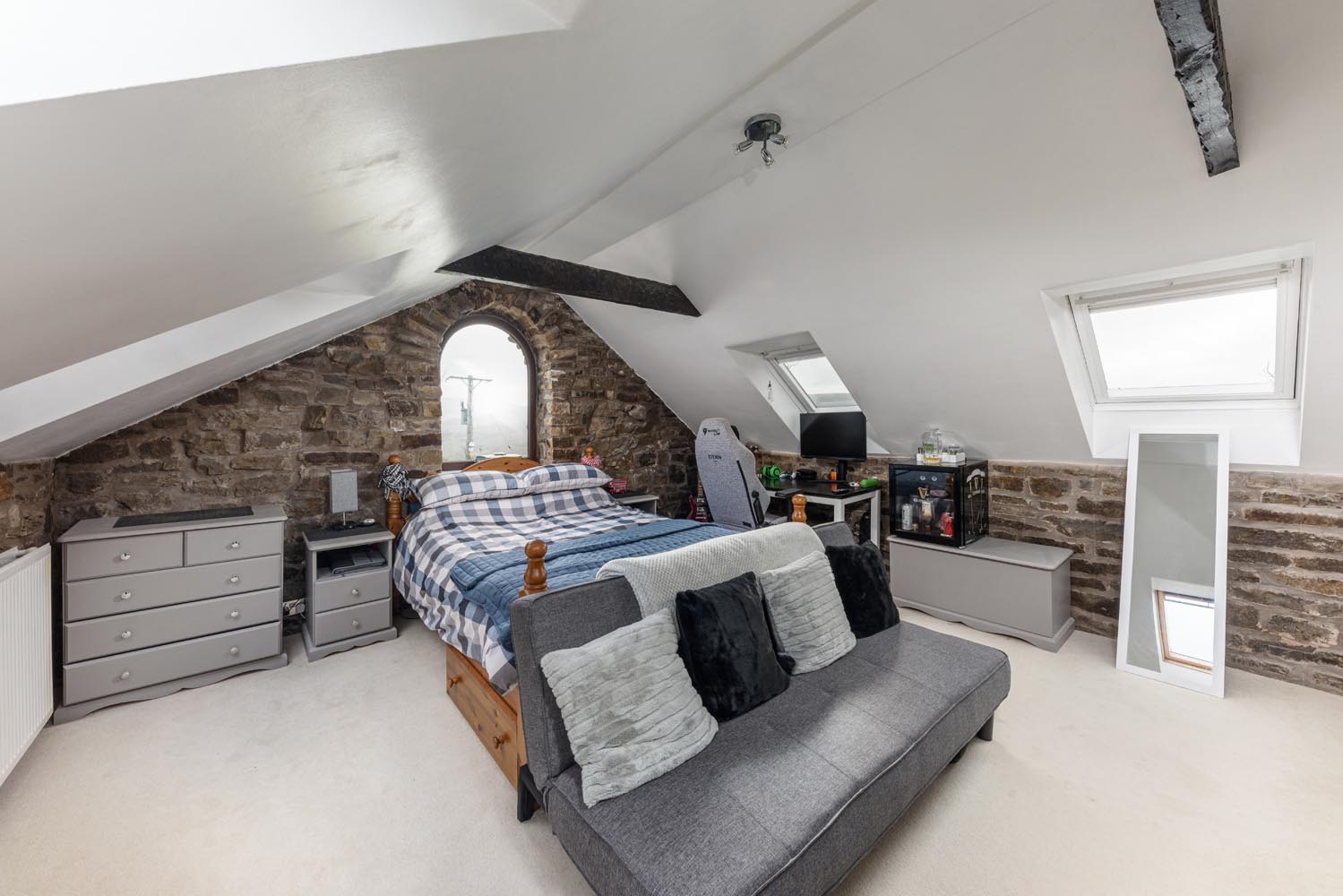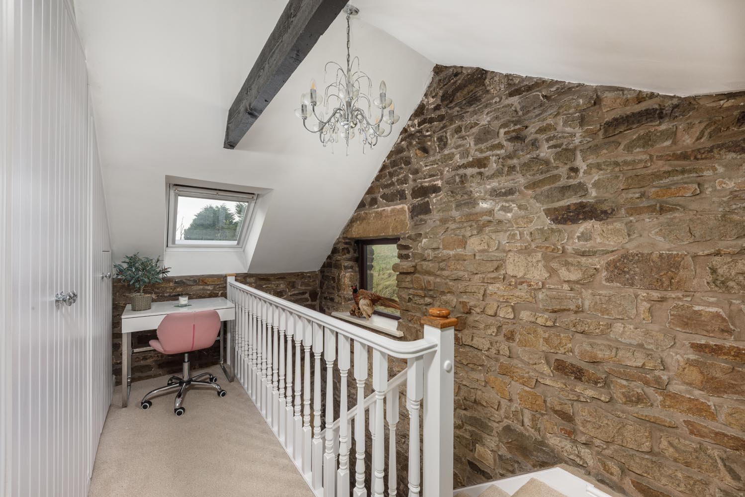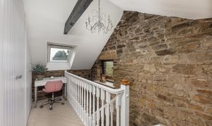 On the first floor, the spacious landing with fitted wardrobes is currently arranged to include a useful study area arranged for home working. The principal bedroom sits beneath exposed trusses and enjoys a second multi-fuel burning stove for winter comfort. Two further double bedrooms each have rooflights and views of the fells, and the family bathroom is neatly appointed with a bath, overhead shower and practical cabinetry. The arrangement feels coherent and ready to enjoy from day one, with clear scope to realise the consented extensions if desired.