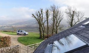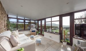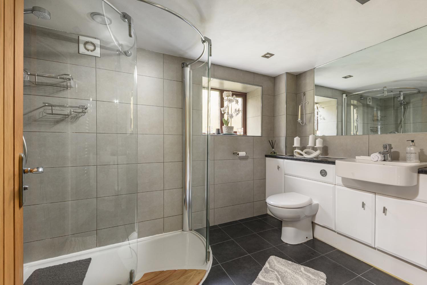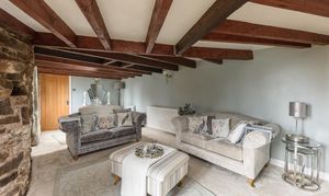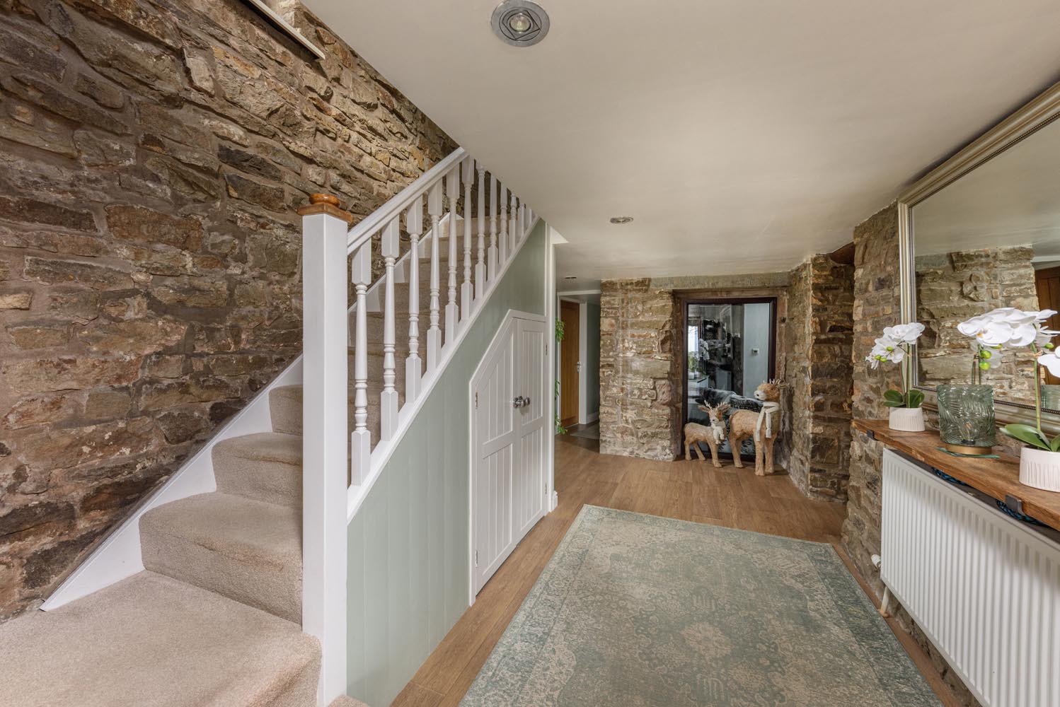 The kitchen opens to a reception hall, where the staircase rises to the first floor, and circulation continues to the rest of the ground floor, including a contemporary shower room and two reception spaces. One is a large, insulated conservatory with three elevations of glazing that take in the panorama and open directly to the garden. The other is a welcoming sitting room, carrying through the character of the original barn. A wide stone fireplace houses a multi-fuel stove, and exposed beams add warmth and texture overhead. The proportions allow for generous seating and reading areas, while deep set windows look out over the surrounding countryside.