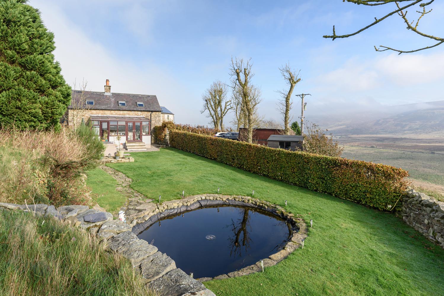 The south and west facing plot has been arranged to make the most of the outlook and the dark sky setting. Broad lawns run out from the house to a natural, stone-edged pond that draws in wildlife. Native hedging and drystone boundaries soften into open moorland and RSPB land, with regular sightings of birds of prey and deer. Close to the house there are practical areas for pots and seating, easy spots for morning coffee by the conservatory and relaxed suppers as the sun drops to the west. The outlook is largely rural, with open countryside in view, and sheltered corners out of the prevailing wind make the garden usable through the seasons. A gravelled drive provides parking for three to four cars and leads to a detached garage.