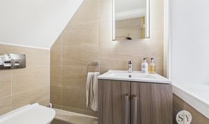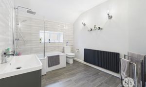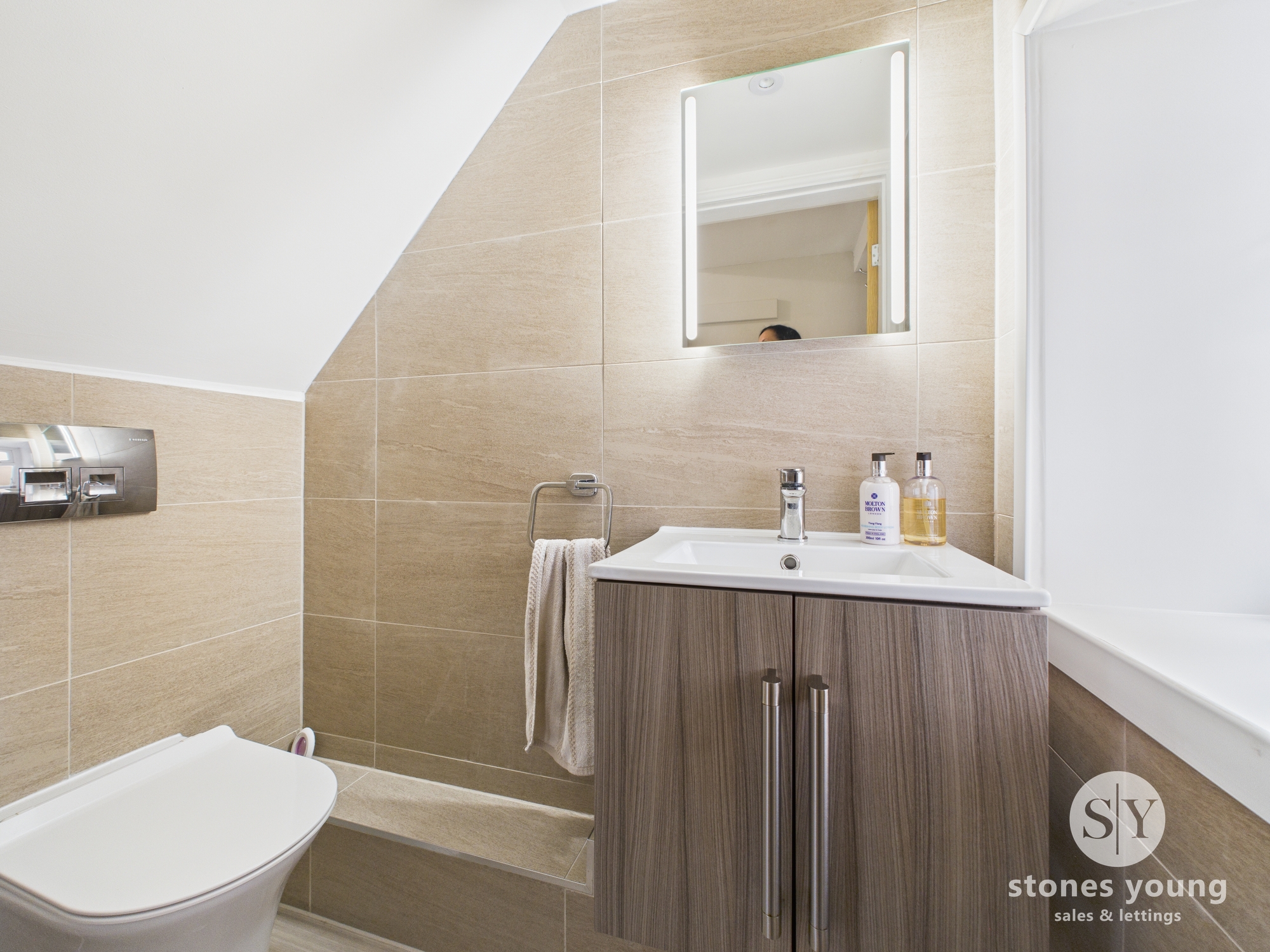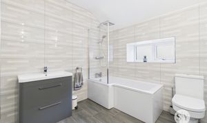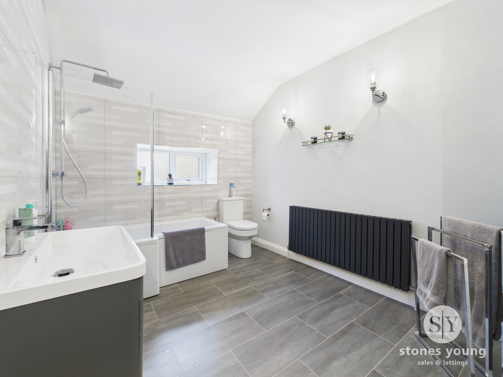 Three piece in white with mains fed shower over bath, vanity unit housing sink, tiled splashbacks, amtico flooring, designer radiator, storage cupboard, uPVC double glazed frosted window.