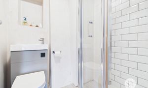 In white with vanity unit housing sink and WC, shower enclosure with mains fed shower, amtico flooring, panel radiator.