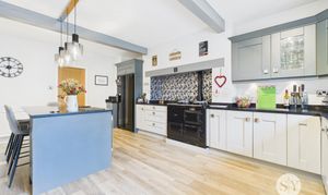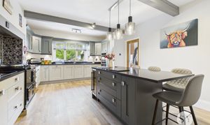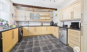 Range of fitted wall and base units with contrasting quartz work surfaces, large central island, gas Aga, extractor, double electric Neff oven/microwave, drinks cooler, dishwasher, space for large fridge freezer. Original ceiling beams,Amtico flooring, uPVC double glazed window, panel radiator.
