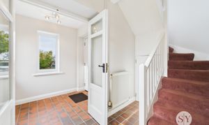 Tiled flooring, stairs to first floor, uPVC double glazed window, under stair storage, panel radiator.