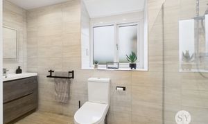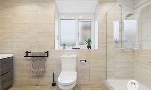 Three piece in white including walk in shower enclosure with mains fed shower, vanity unit housing sink, tiled floor to ceiling, amtico flooring, heated towel radiator, storage cupboard, uPVC double glazed frosted window.