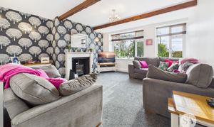 Carpet flooring, fireplace with wooden beam, granite hearth housing gas stove, ceiling beams, uPVC double glazed window x4, panel radiator x2.