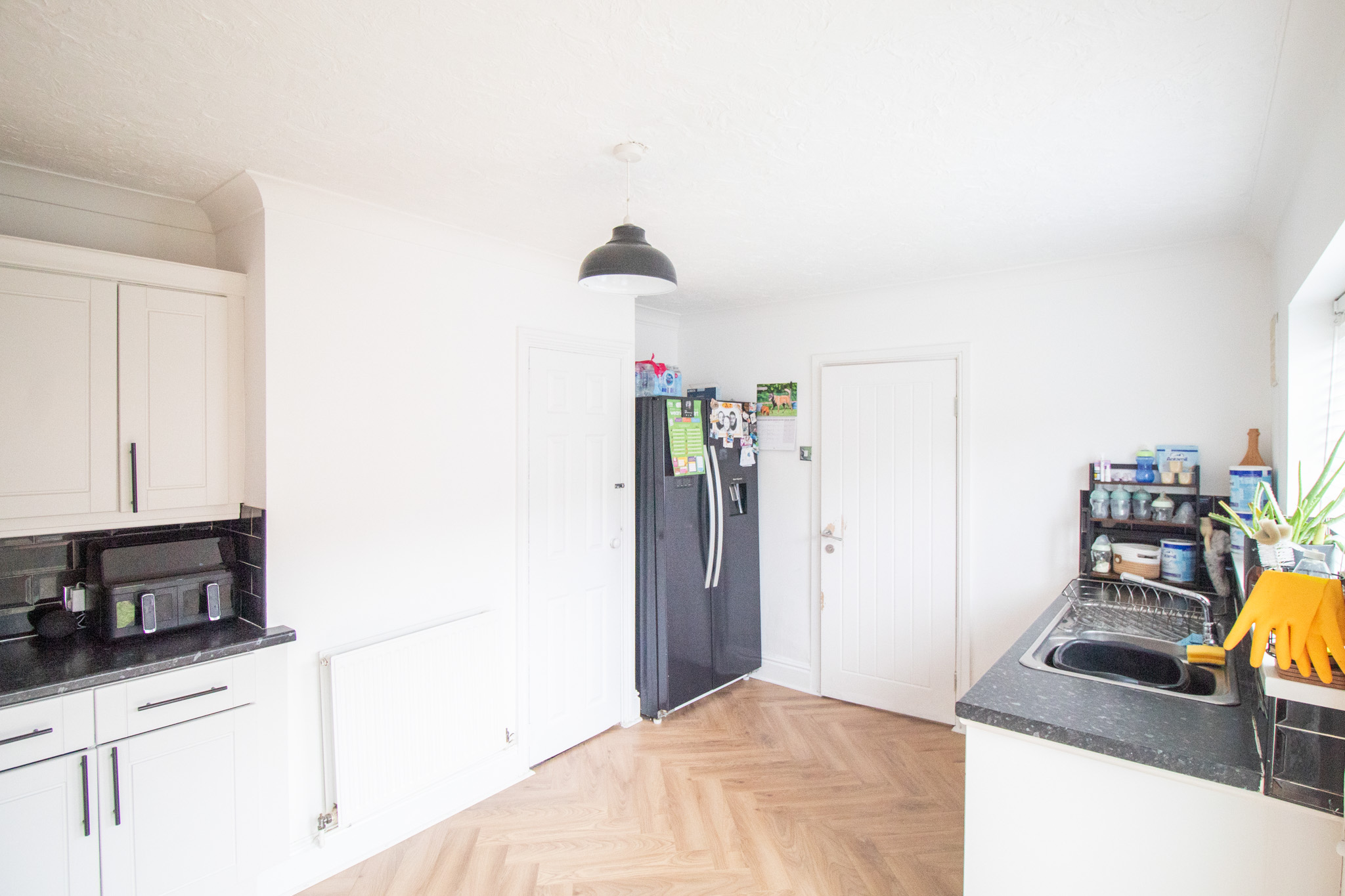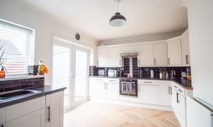 With laminate flooring, white shaker style units, integrated oven, hob, and extractor, sink and tap, plumbing for washing machine, space for American Fridge Freezer, storage cupboard, radiator, and french doors to the rear garden.
