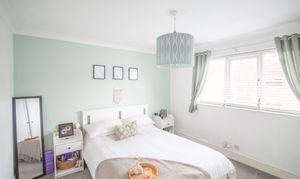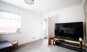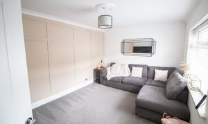 With carpet, storage cupboard, radiator, and large window overlooking the rear garden.