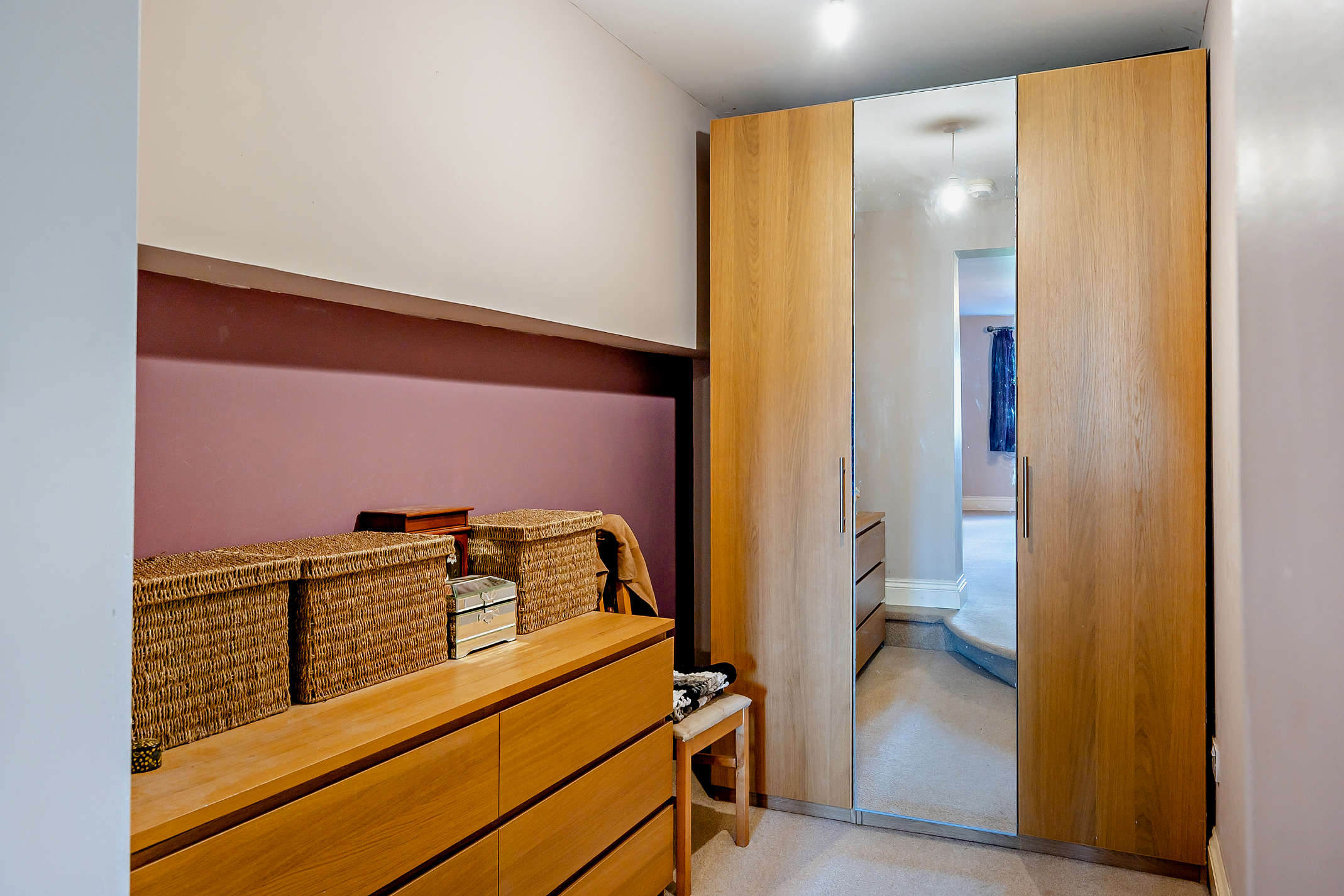 The principal bedroom is a large double room with a window that overlooks the landscaped side garden. There are built-in cupboards and a walk-in dressing room providing ample storage. The spacious en suite shower room has a tiled floor and walls to dado height.