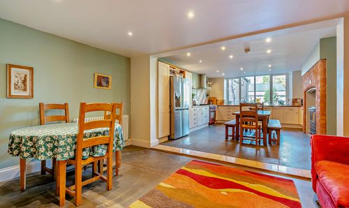 Open plan to the kitchen and providing a wonderful sense of space the flagstone flooring continues into this large dining room, which is a versatile space currently used more as a family area.