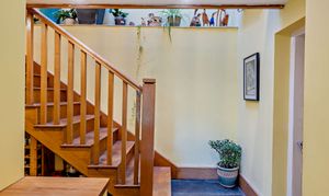The entrance hall is accessed up stone steps and in through a glass door. Adjacent is a separate WC, and beyond is the bottom of the staircase with the impressive lightwell above it.